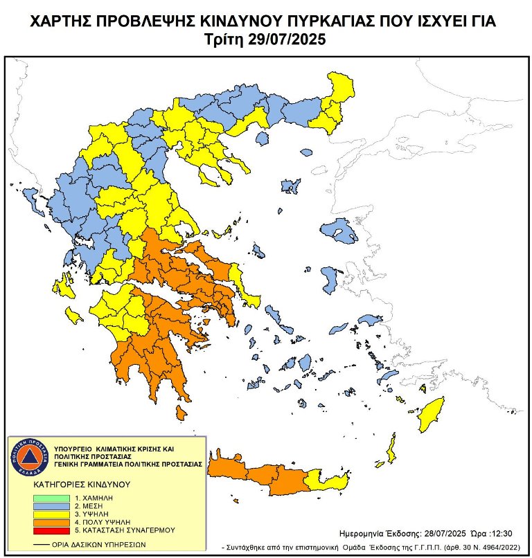 Πολύ υψηλή κατηγορία κινδύνου ( 4) προβλέπει ή Γενική Γραμματεία Πολιτικής Προστασίας σε περιοχές της Δυτικής Ελλάδας και ιδιαίτερα στην ΠΕ Αχαΐας, όπως φαίνεται στον επισυναπτόμενο ημερήσιο Χάρτη Πρόβλεψης Κινδύνου Πυρκαγιάς για την Τρίτη 29/07/2025. Εφισταται η προσοχή στους πολίτες να είναι προσεκτικοί και να αποφεύγουν ενέργειες που μπορούν να προκαλέσουν πυρκαγιά από αμέλεια.