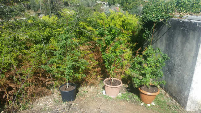 • στον προαύλιο χώρο του σπιτιού, (5) δενδρύλλια κάνναβης σε πλήρη ανάπτυξη, ύψους από 0,9 έως 1,3 μέτρων.