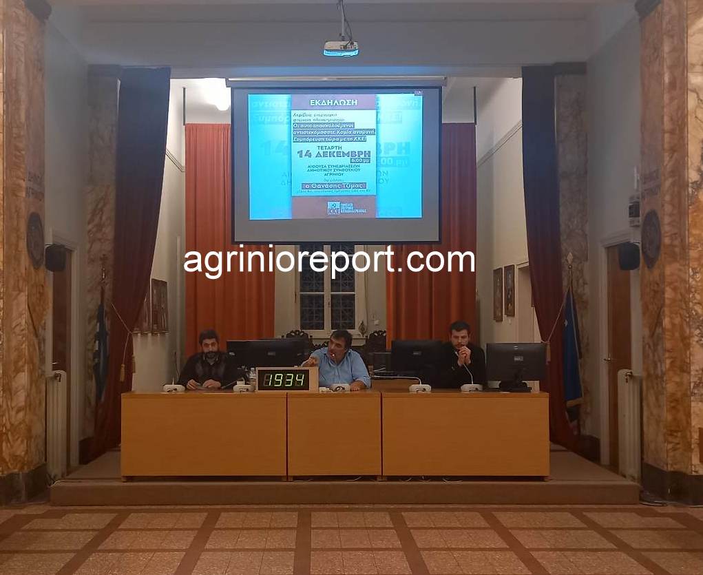 Πραγματοποιήθηκε η εκδήλωση με τίτλο «Ακρίβεια, ενεργειακή φτώχεια, πλειστηριασμοί… Οι αυτοαπασχολούμενοι αντιστεκόμαστε. Καμία αναμονή. Συμπόρευση τώρα με το ΚΚΕ!», που διοργάνωσε η Τομεακή Επιτροπή Αιτωλοακαρνανίας του ΚΚΕ, την Τετάρτη 14 Δεκέμβρη, ώρα 6μμ, στην αίθουσα συνεδριάσεων Δημοτικού Συμβουλίου Αγρινίου, (πρώην Τράπεζα Ελλάδος) με κύριο ομιλητή τον Θανάση Τζίμα, μέλος της ΚΕ και υπεύθυνος του Τμήματος ΕΒΕ της ΚΕ του ΚΚΕ.