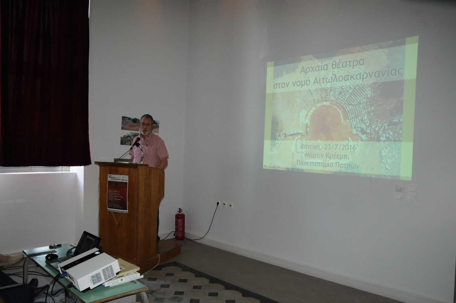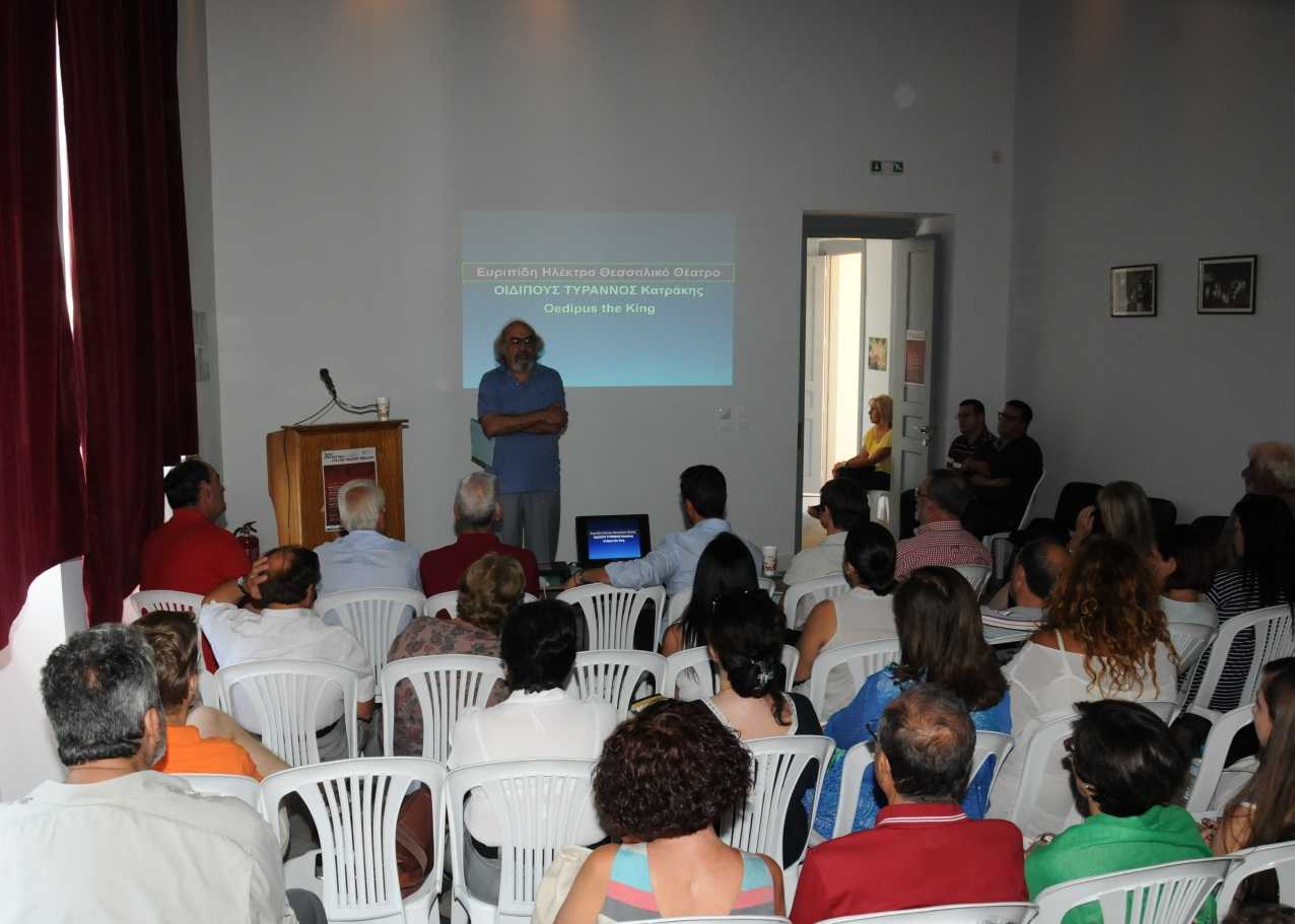 Το πρωί του Σαββάτου 23 Ιουλίου στον ίδιο χώρο, πραγματοποιήθηκε ημερίδα με θέμα «Αρχαίο Ελληνικό Δράμα και Θέατρο», στην οποία συμμετείχαν με ομιλίες τους η προϊσταμένη της Εφορείας Αρχαιοτήτων Αιτωλ/νίας και Λευκάδας – Αρχαιολόγος Ολυμπία Βικάτου, ο αν. Καθηγητής και Πρόεδρος του Τμήματος Θεατρικών Σπουδών Πανεπιστημίου Πατρών Μάρτιν Κρέμπ, η λέκτορας του τμήματος Θεατρικών Σπουδών Παν/μίου Πατρών Ελένη Καράμπελα και ο Φιλόλογος – Θεατρολόγος Γιώργος Μικέλης.
