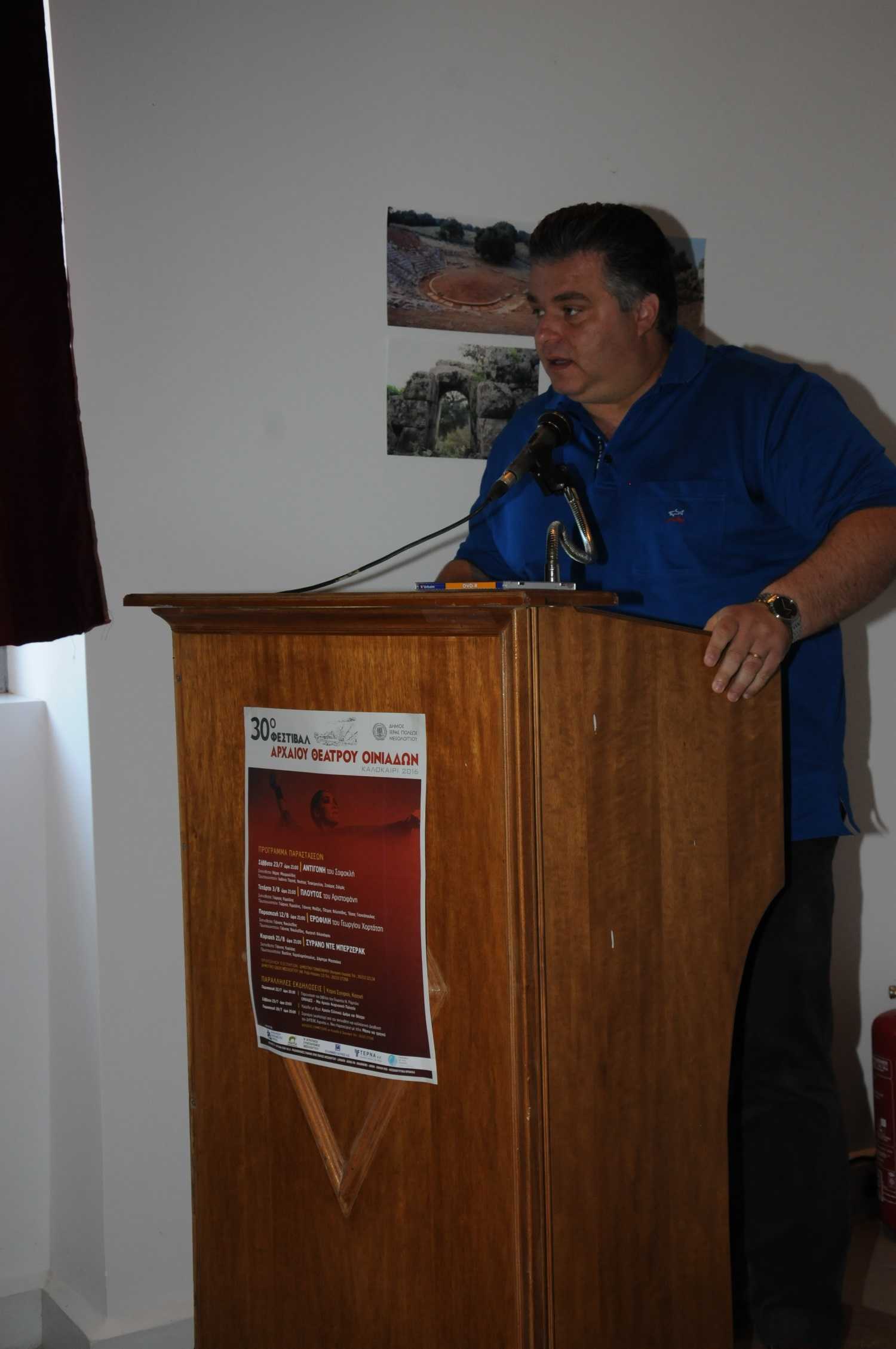 Ο Δήμαρχος Ιερής Πόλης Μεσολογγίου Νίκος Καραπάνος απευθύνοντας χαιρετισμό στην εκδήλωση συνεχάρη το δημιουργό Γ. Ρόμπολα, καθώς επίσης τον ιδρυτή του ιστορικού μουσείου «Διέξοδος» Ν. Κορδόση για την υποστήριξη της πρωτοβουλίας. Μιλώντας δε για το Φεστιβάλ Αρχαίου Θεάτρου σημείωσε ότι «…Αποτελεί ένα κορυφαίο θεσμό πολιτισμού για το Δήμο Ιερής Πόλης Μεσολογγίου αλλά και την περιοχή, για τον οποίο φέτος καταβλήθηκε κάθε προσπάθεια προκειμένου να πλαισιωθεί τόσο με κορυφαίες παραστάσεις, αλλά και ιδιαίτερα αξιόλογες εκδηλώσεις, που στόχο έχουν την περαιτέρω αναβάθμισή το. Στόχος μας, είναι να δημιουργήσουμε ένα πλαίσιο πολιτιστικής δραστηριότητας εστιάζοντας στην έννοια, το ρόλο και τη σημασία του θεσμού. Η περιοχή μας άλλωστε, έχει βαθιές και μακραίωνες ρίζες στην ιστορία και τον πολιτισμό».