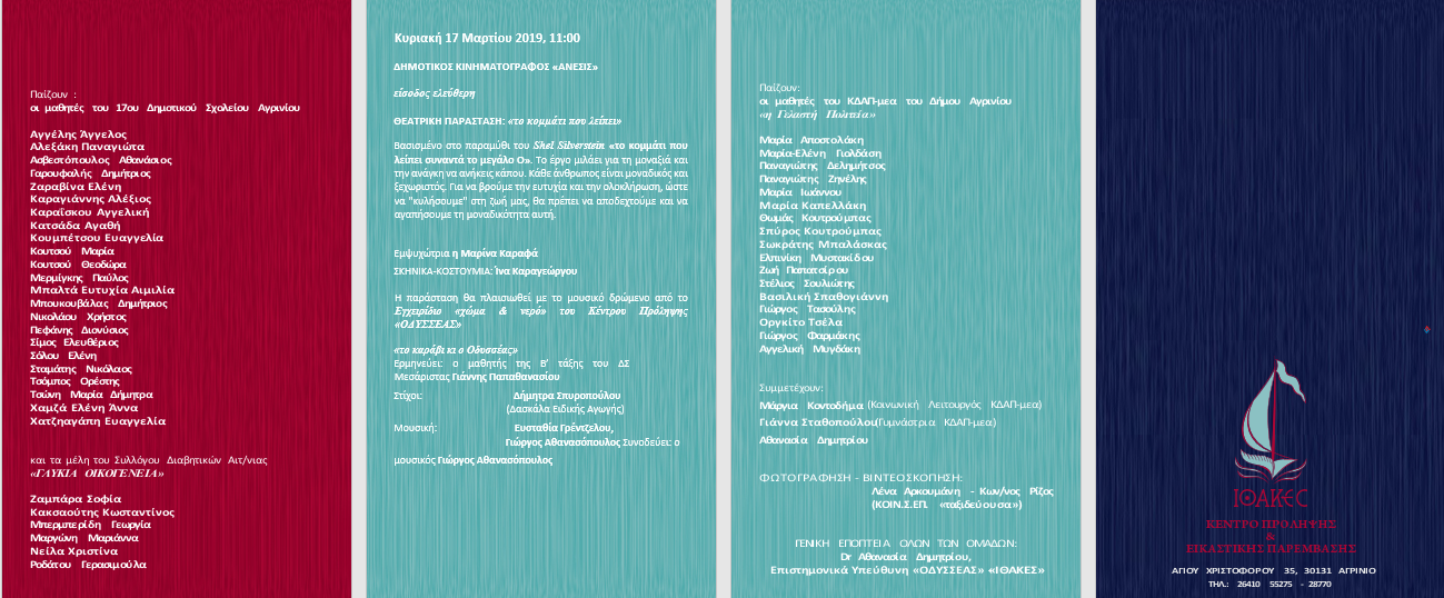 Ακολουθεί το πρόγραμμα Εκδηλώσεων Νέας Δομης ”ΙΘΑΚΕΣ” Κέντρου Πρόληψης ”ΟΔΥΣΣΕΑΣ”-Δήμου Αγρινίου.