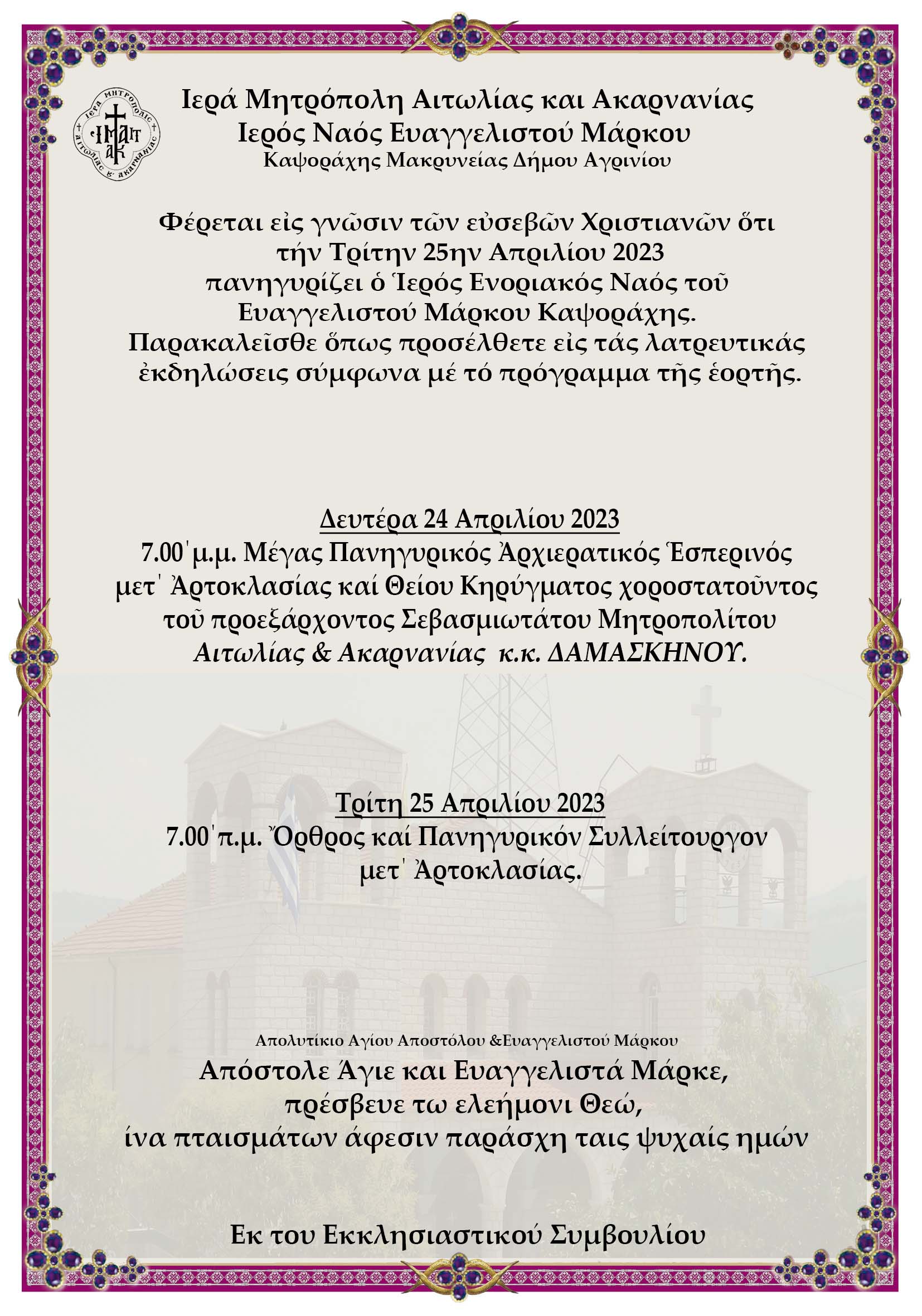 Πρόγραμμα εορτασμού Ι.Ν. Ευαγγελισμού Μάρκου Καψοράχης Μακρυνείας Δ. Αγρινίου