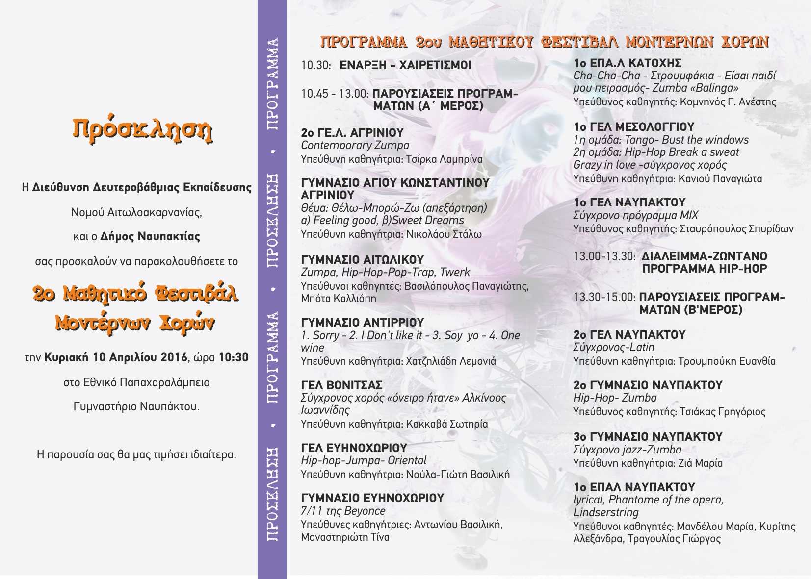 Για δεύτερη συνεχή χρονιά, ο Δήμος Ναυπακτίας και η Διεύθυνση Δευτεροβάθμιας Εκπαίδευσης Νομού Αιτωλοακαρνανίας διοργανώνουν το 2ο Μαθητικό Φεστιβάλ Μοντέρνων Χορών που θα πραγματοποιηθεί στις 10 Απριλίου και ώρα 10:30 π.μ. στο Παπαχαραλάμπειο Κλειστό Γήπεδο Ναυπάκτου.