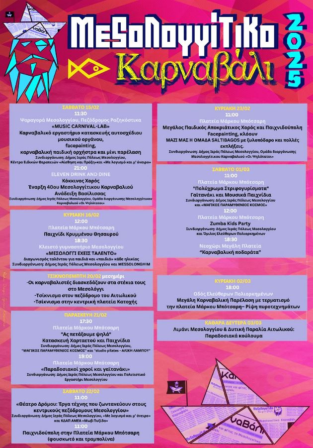 Ο Δήμος Ιερής Πόλης Μεσολογγίου ανακοινώνει το πρόγραμμα των αποκριάτικων εκδηλώσεων και σας προσκαλεί να διασκεδάσετε, να χορέψετε και να γελάσετε στο 40ο Μεσολογγίτικο Καρναβάλι!