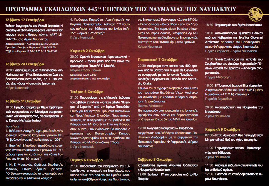 Ο Δήμος Ναυπάκτου και φέτος ξεκίνησε τις εκδηλώσεις της 445ης Επετείου της Ναυμαχίας της Ναυπάκτου.