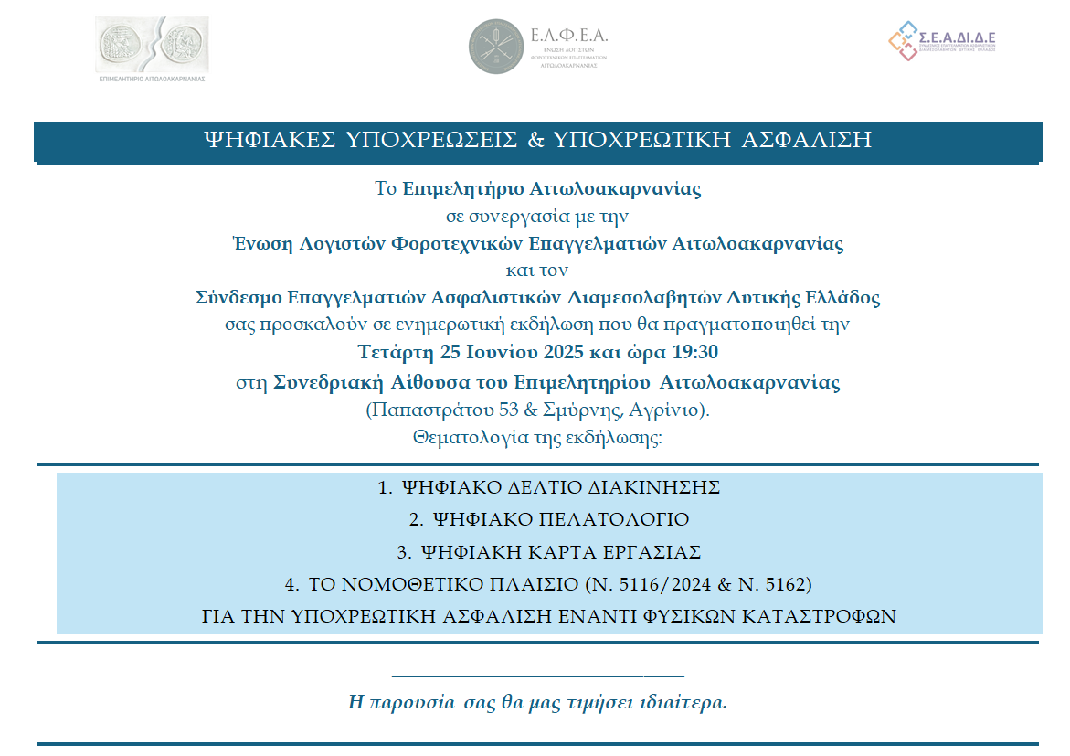 Πρόσκληση σε Ενημερωτική Εκδήλωση για τις Ψηφιακές Υποχρεώσεις & το Νέο Ασφαλιστικό Πλαίσιο//25.06.2025 και ώρα 19.30 στη Συνεδριακή Αίθουσα του Επιμελητηρίου Αιτωλοακαρνανίας.