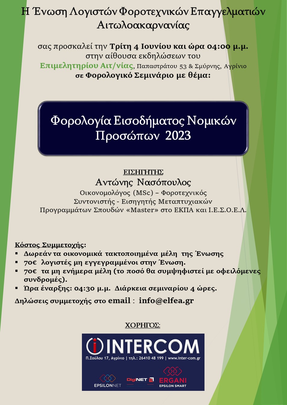 Πρόσκληση σε φορολογική ημερίδα που διοργανώνει η Ένωση Λογιστών Φοροτεχνικών Επαγγελματιών Αιτ/νίας