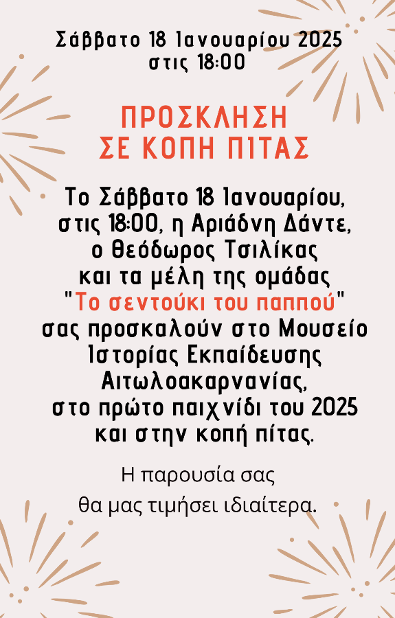 Ακολουθεί η πρόσκληση για την κοπή πίτας της ερευνητικής ομάδας “Το σεντούκι του παππού”, που θα πραγματοποιηθεί το Σάββατο 18 Ιανουαρίου, στις 6 το απόγευμα, στο Μουσείο Ιστορίας Εκπαίδευσης στο Αγγελόκαστρο.