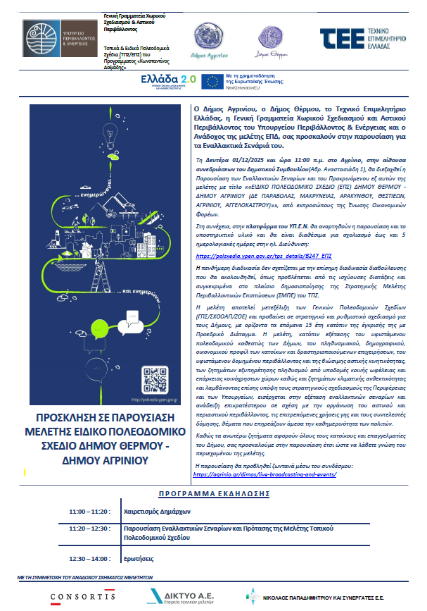 Ο Δήμος Αγρινίου, ο Δήμος Θέρμου, το Τεχνικό Επιμελητήριο Ελλάδας, η Γενική Γραμματεία Χωρικού Σχεδιασμού και Αστικού Περιβάλλοντος του Υπουργείου Περιβάλλοντος & Ενέργειας, καθώς και ο Ανάδοχος της Μελέτης ΕΠΣ, προσκαλούν τους πολίτες, τους φορείς και τα ΜΜΕ στην επίσημη παρουσίαση των Εναλλακτικών Σεναρίων και του Προκρινόμενου Σεναρίου της μελέτης: