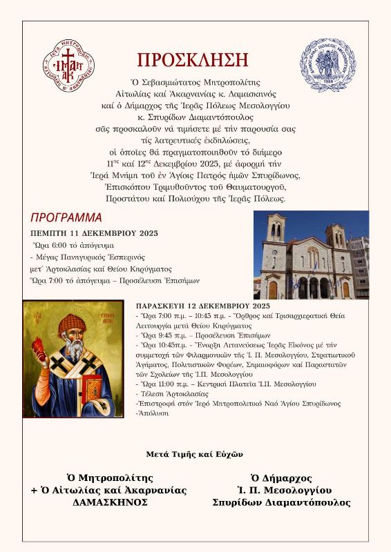 Ὁ Σεβασμιώτατος Μητροπολίτης Αἰτωλίας καὶ Ἀκαρνανίας κ. Δαμασκηνὸς καὶ ὁ Δήμαρχος τῆς Ἱερᾶς Πόλεως Μεσολογγίου κ. Σπυρίδων Διαμαντόπουλος σᾶς προσκαλοῦν νὰ τιμήσετε μὲ τὴν παρουσία σας τὶς λατρευτικὲς ἐκδηλώσεις, οἱ ὁποῖες θὰ πραγματοποιηθοῦν τὸ διήμερο 11ης καὶ 12ης Δεκεμβρίου 2025, μὲ ἀφορμὴ τὴν Ἱερὰ Μνήμη τοῦ ἐν Ἁγίοις Πατρὸς ἡμῶν Σπυρίδωνος, Ἐπισκόπου Τριμυθοῦντος τοῦ Θαυματουργοῦ, Προστάτου καὶ Πολιούχου τῆς Ἱερᾶς Πόλεως.