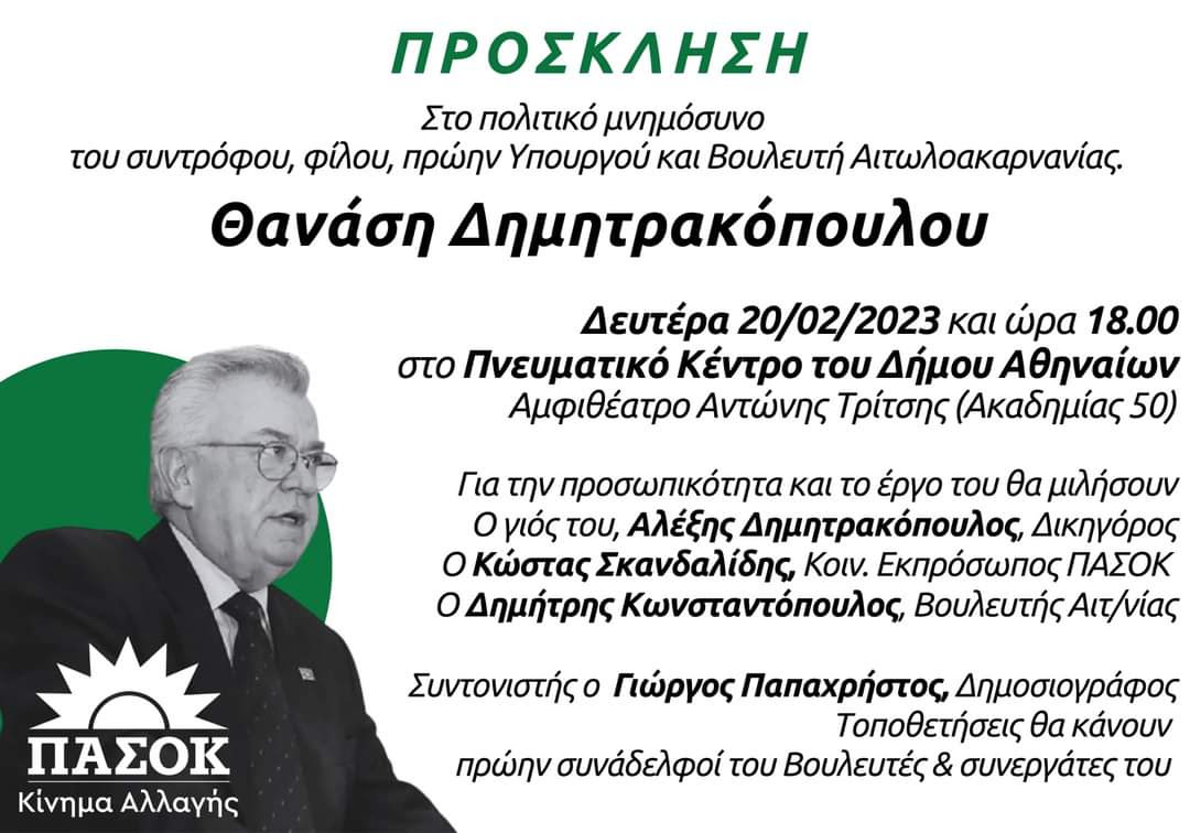 Πρόσκληση στο πολιτικό μνημόσυνο του πρώην Βουλευτή Αιτ/νίας Θανάση Δημητρακόπουλου
