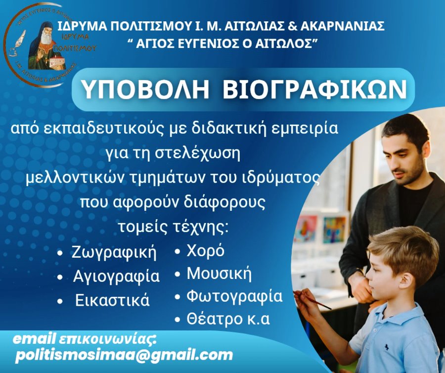 Το Ίδρυμα Πολιτισμού της Ιεράς Μητροπόλεως Αιτωλίας και Ακαρνανίας «Άγιος Ευγένιος ο Αιτωλός» δέχεται βιογραφικά σημειώματα από εκπαιδευτικούς με διδακτική εμπειρία για τη στελέχωση μελλοντικών τμημάτων του Ιδρύματος που αφορούν διάφορους τομείς τέχνης: