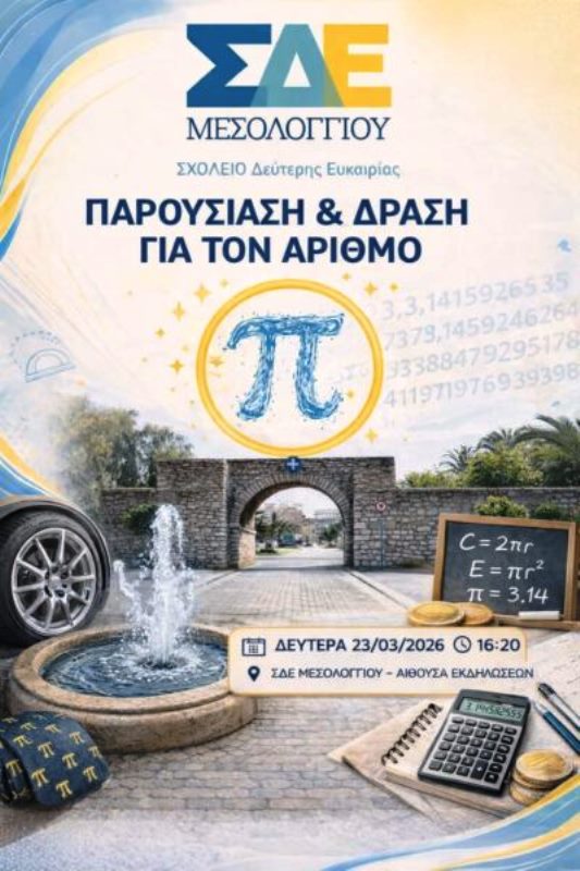 Με αφορμή την Παγκόσμια Ημέρα Μαθηματικών (14 Μαρτίου – 3/14) και τη συμπλήρωση 200 χρόνων από την ηρωική Έξοδο του Μεσολογγίου, το Σχολείο Δεύτερης Ευκαιρίας Μεσολογγίου υλοποίησε μια ξεχωριστή βιωματική εκπαιδευτική δράση. Το ΣΔΕ Μεσολογγίου κινήθηκε με μεγάλη τιμή και ευαισθησία απέναντι σε αυτά τα δύο σημαντικά γεγονότα, αναδεικνύοντας τη σύνδεση της γνώσης με την ιστορική μνήμη.
