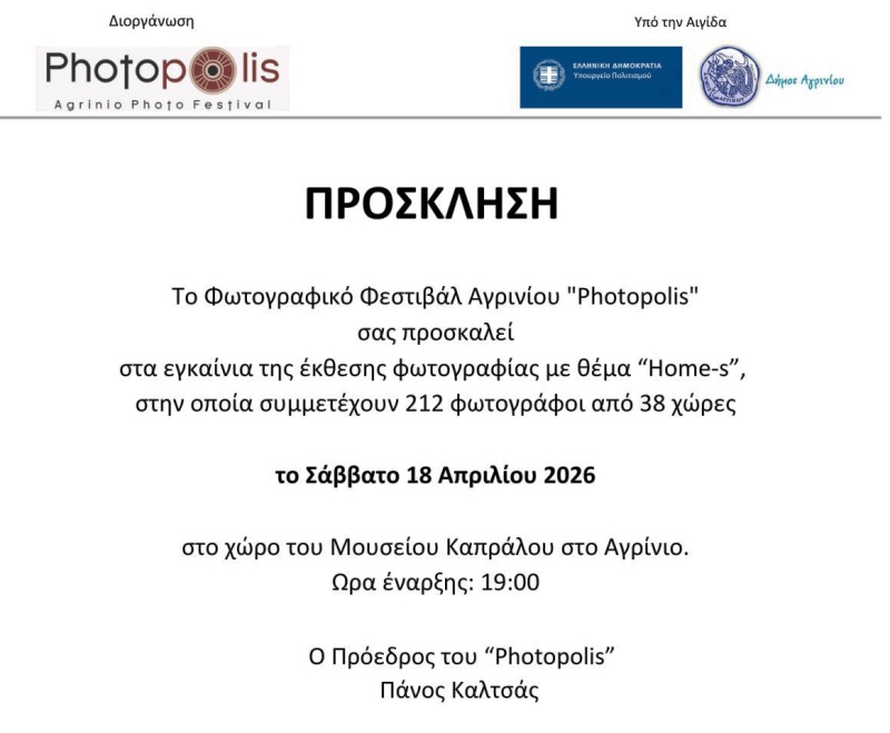 Εγκαίνια της Μεγάλης Φωτογραφικής Έκθεσης με θέμα “Home-s”, που θα πραγατοποιηθεί στο Μουσείο Καπράλου στο Αγρίνιο, το Σάββατο 18 Απριλίου και ώρα 19:00, υπό την Αιγίδα του Δήμου Αγρινίου.
