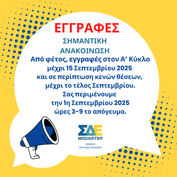 Το ΣΔΕ Μεσολογγίου θα λειτουργεί από την 1η Σεπτεμβρίου απογευματινές ώρες 3-9 το απόγευμα για ενημέρωση του κοινού και νέες εγγραφές.