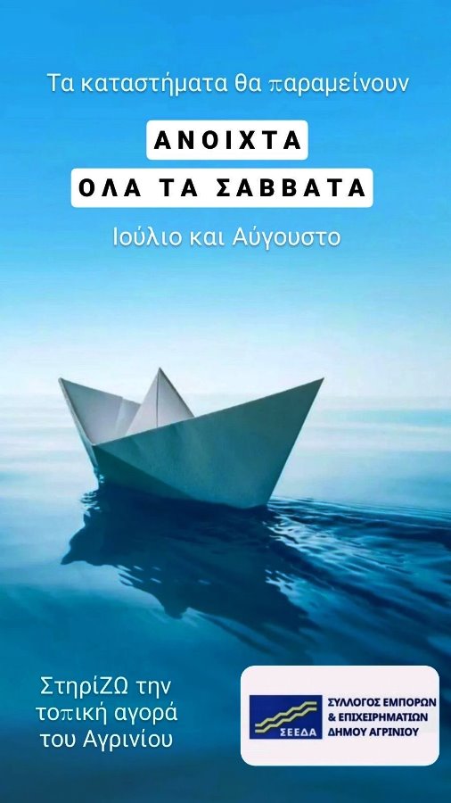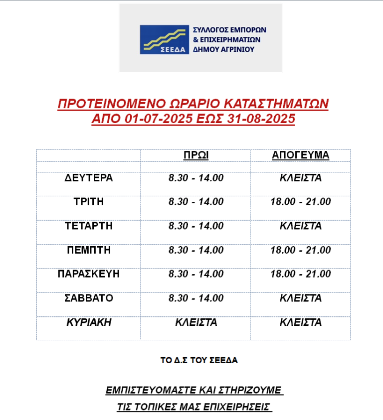 Ο Σύλλογος Εμπόρων και Επιχειρηματιών Δήμου Αγρινίου ΣΕΕΔΑ ενημερώνει τόσο τους συναδέλφους εμπόρους, όσο και το καταναλωτικό κοινό για το προτεινόμενο θερινό ωράριο λειτουργίας των καταστημάτων της Πόλης μας για τους μήνες Ιούλιο και Αύγουστο 2025, προτείνοντας επίσης τα καταστήματα να παραμείνουν Ανοιχτά τα Σάββατα του Καλοκαιριού.