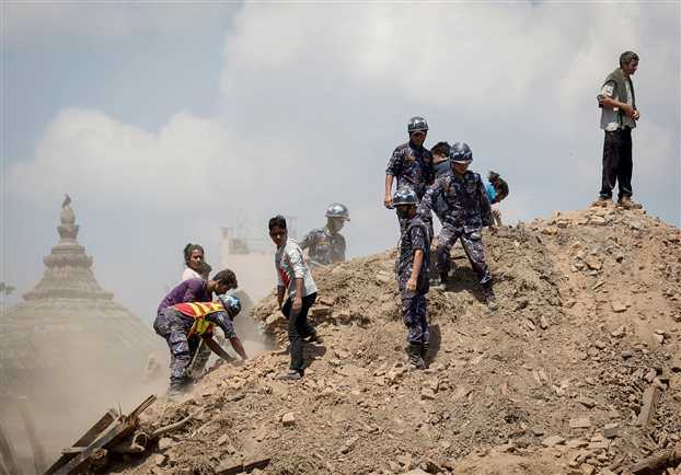 Στην Κατμαντού, την πρωτεύουσα του Νεπάλ, εκατοντάδες κτίρια κατέρρευσαν. Μια ομάδα διασωστών, με επικεφαλής τον αξιωματικό Σάντος Νεπάλ, προσπαθούσε όλη τη νύχτα να ανοίξει δίοδο σε ένα από τα κτίρια αυτά. Ήταν όμως αναγκασμένοι να σκάβουν με τα χέρια και με εργαλεία χειρός γιατί είναι αδύνατον να περάσουν βαριά μηχανήματα, όπως μπουλντόζες, από τα σοκάκια της αρχαίας πόλης. «Πιστεύουμε ότι υπάρχουν παγιδευμένοι μέσα», είπε ο Σάντος δείχνοντας τα ερείπια της τριώροφης κατοικίας.