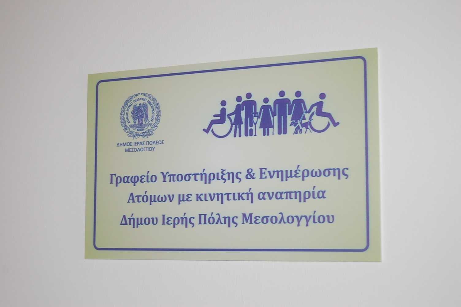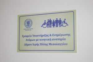 Ξεκίνησε σήμερα την λειτουργία του στο 2ο όροφο του Δημαρχείου, το Γραφείο Υποστήριξης και Ενημέρωσης Ατόμων με κινητικά προβλήματα του Δήμου Ιερής Πόλης Μεσολογγίου. Υπεύθυνος λειτουργίας του Γραφείου, είναι ο κ. Ιωάννης Σταύρου, ενώ η γραμματειακή υποστήριξη γίνεται από τον κ. Ιωάννη Ροδόπουλο.