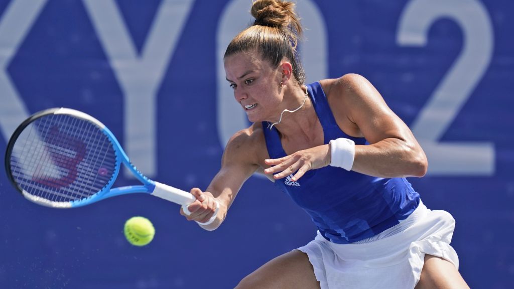 Maria Sakkari, of Greece, plays against Anett Kontaveit, of Estonia, during the first round of the tennis competion at the 2020 Summer Olympics, Saturday, July 24, 2021, in Tokyo, Japan. (AP Photo/Seth Wenig)