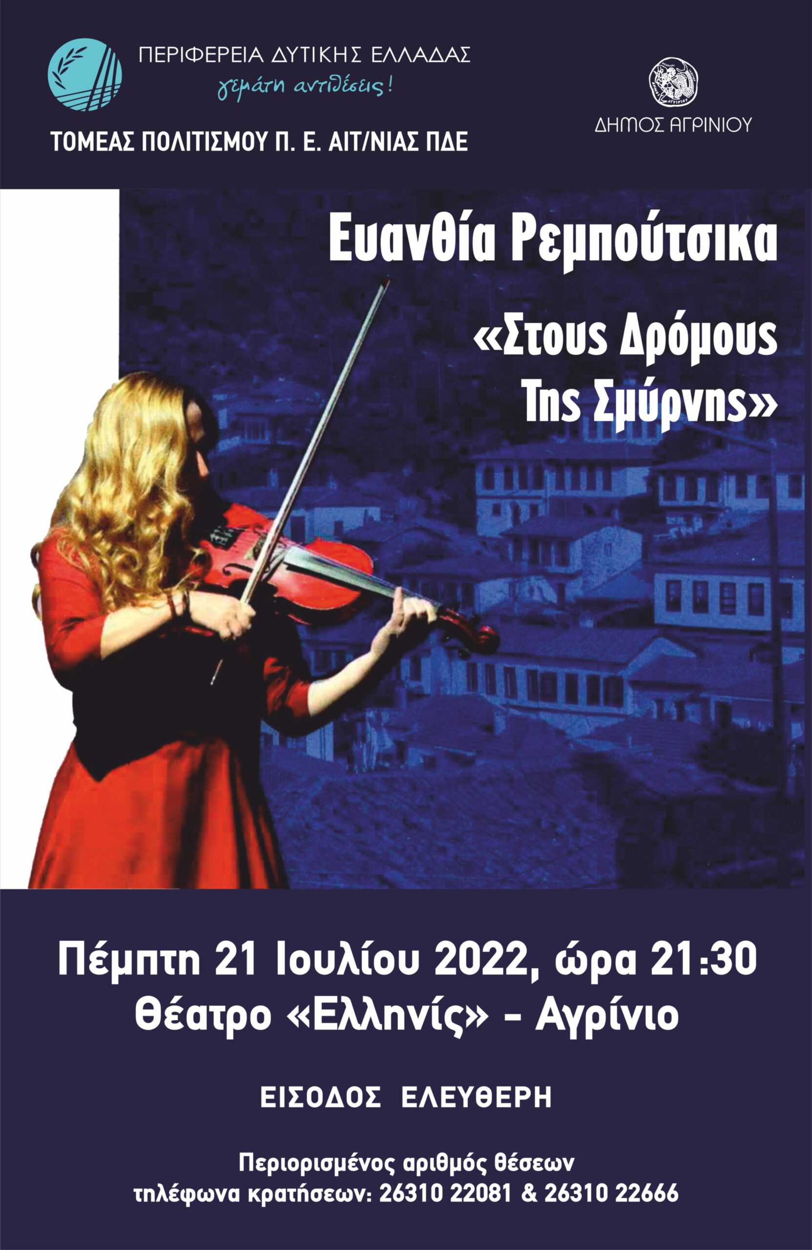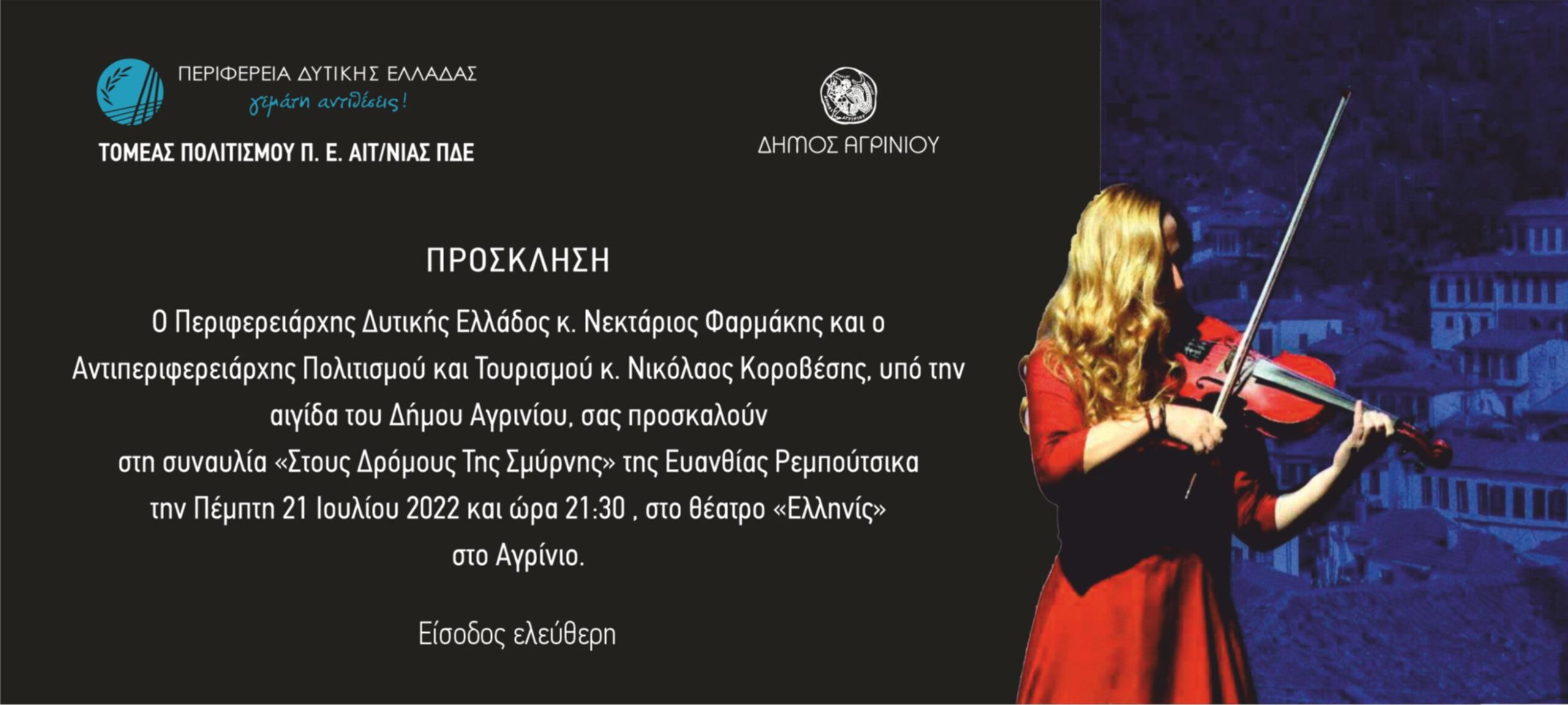 Ο Περιφερειάρχης Δυτικής Ελλάδας, Νεκτάριος Φαρμάκης και ο Αντιπεριφερειάρχης Πολιτισμού και Τουρισμού, Νικόλαος Κοροβέσης σας προσκαλούν στη μουσική συναυλία της Ευανθίας Ρεμπούτσικα με τίτλο «Στους Δρόμους της Σμύρνης».