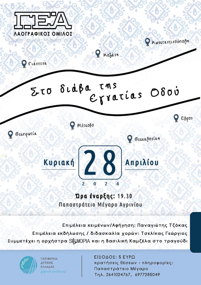 “Στο διάβα της Εγνατίας οδού” είναι ο τίτλος της μεγάλης μουσικοχορευτικής παράστασης που διοργανώνεται από τον Λαογραφικό Όμιλο της Γυμναστικής Εταιρείας Αγρινίου (ΓΕΑ), την Κυριακή 28 Απριλίου 2024 και ώρα 19:30, στο Παπαστράτειο Μέγαρο της Γυμναστικής Εταιρείας Αγρινίου.