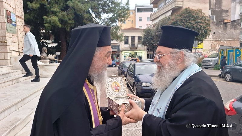 Αρχικά, στα προπύλαια του Ιερού Μητροπολιτικού Ναού πραγματοποιήθηκε η υποδοχή αποτμήματος του Τιμίου Λειψάνου του Οσίου Αμφιλοχίου, το οποίο εκόμισε ο π. Αντίπας και υποδέχθηκε ο Πρωτοσύγκελλος της Ιεράς Μητροπόλεως, Αρχιμ. Θεόκλητος Ράπτης, ως εκπρόσωπος του Μητροπολίτου Αιτωλίας και Ακαρνανίας κ. Δαμασκηνού.