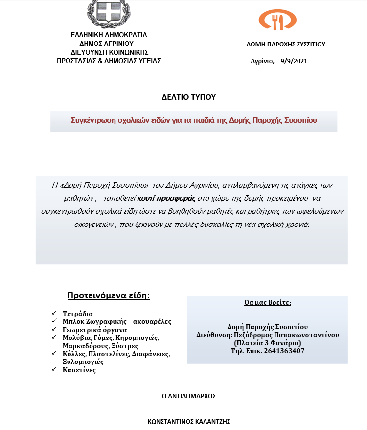 Συγκέντρωση σχολικών ειδών για τα παιδιά της Δομής Παροχής Συσσιτίου