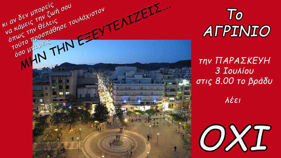 Συγκέντρωση του “Όχι” σήμερα το απόγευμα στις 8 μ.μ. στην κεντρική πλατεία δημοκρατίας στο Αγρίνιο.