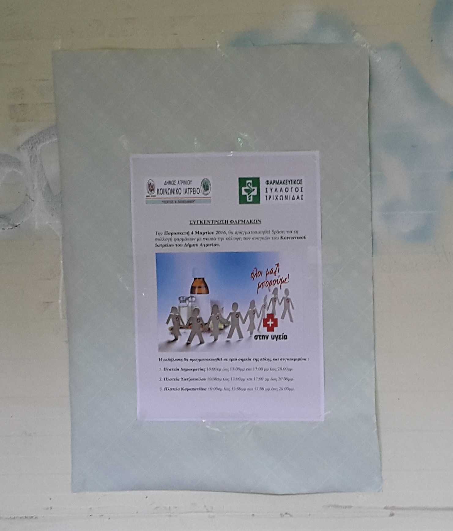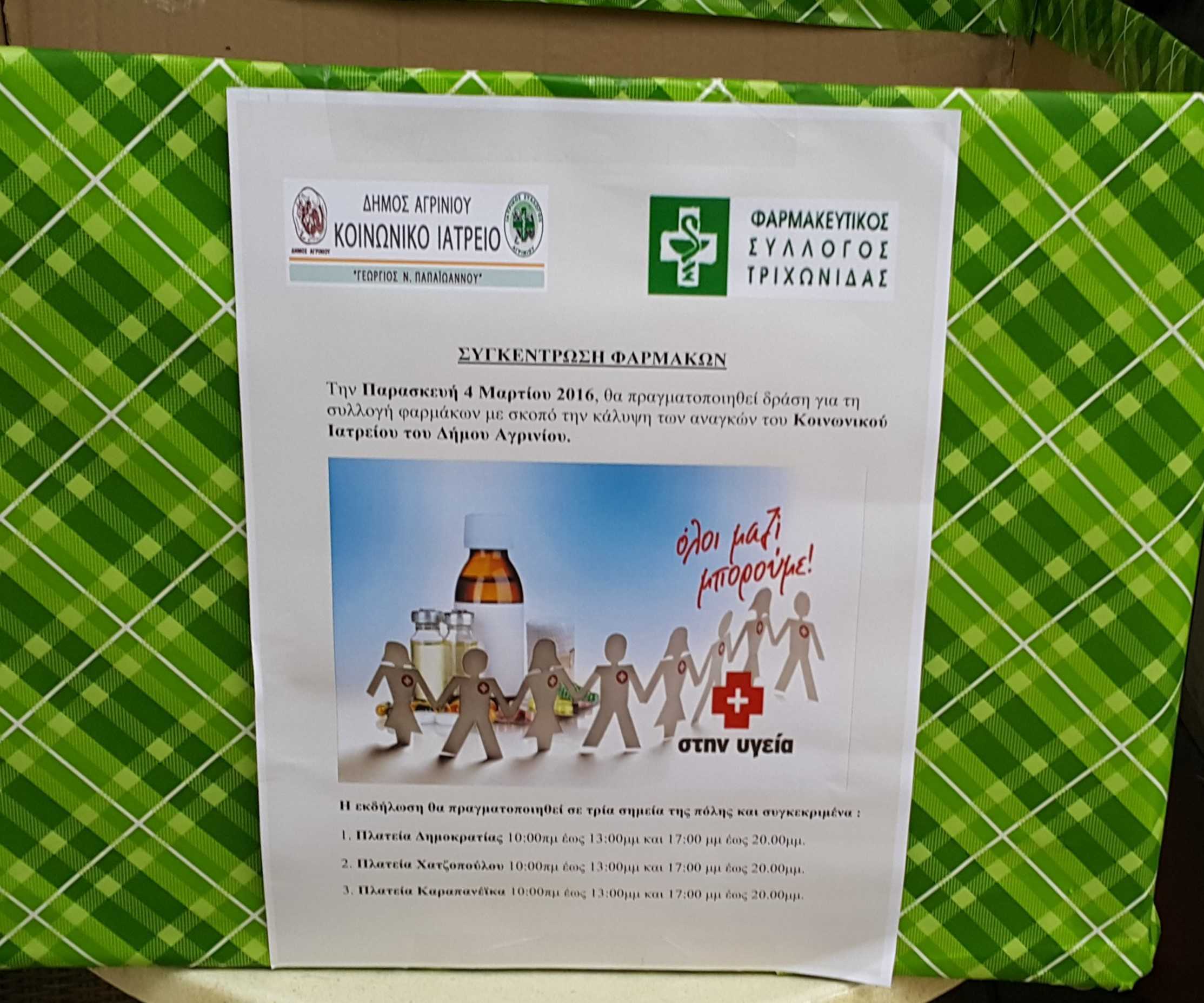 Με ιδιαίτερη επιτυχία πραγματοποιείται αυτή τη στιγμή η κοινωνική δράση την οποία οργάνωσε η Διεύθυνση Κοινωνικής Προστασίας και Δημόσιας Υγείας του Κοινωνικού Ιατρείου του Δήμου Αγρινίου και αφορά στη συγκέντρωση φαρμάκων για τις ανάγκες του Ιατρείου.20160304_114113