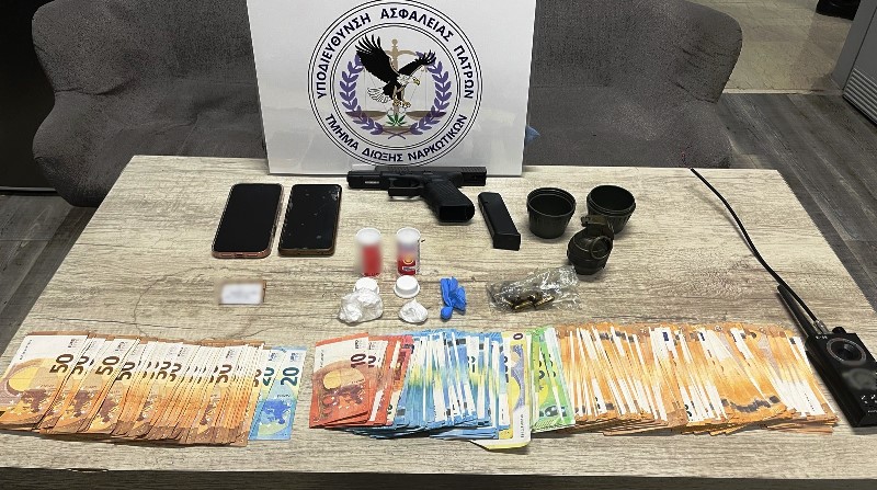 Κατασχέθηκαν -80- γραμμάρια κοκαΐνης, χειροβομβίδα, πιστόλι, φυσίγγια και -15.450- ευρώ.