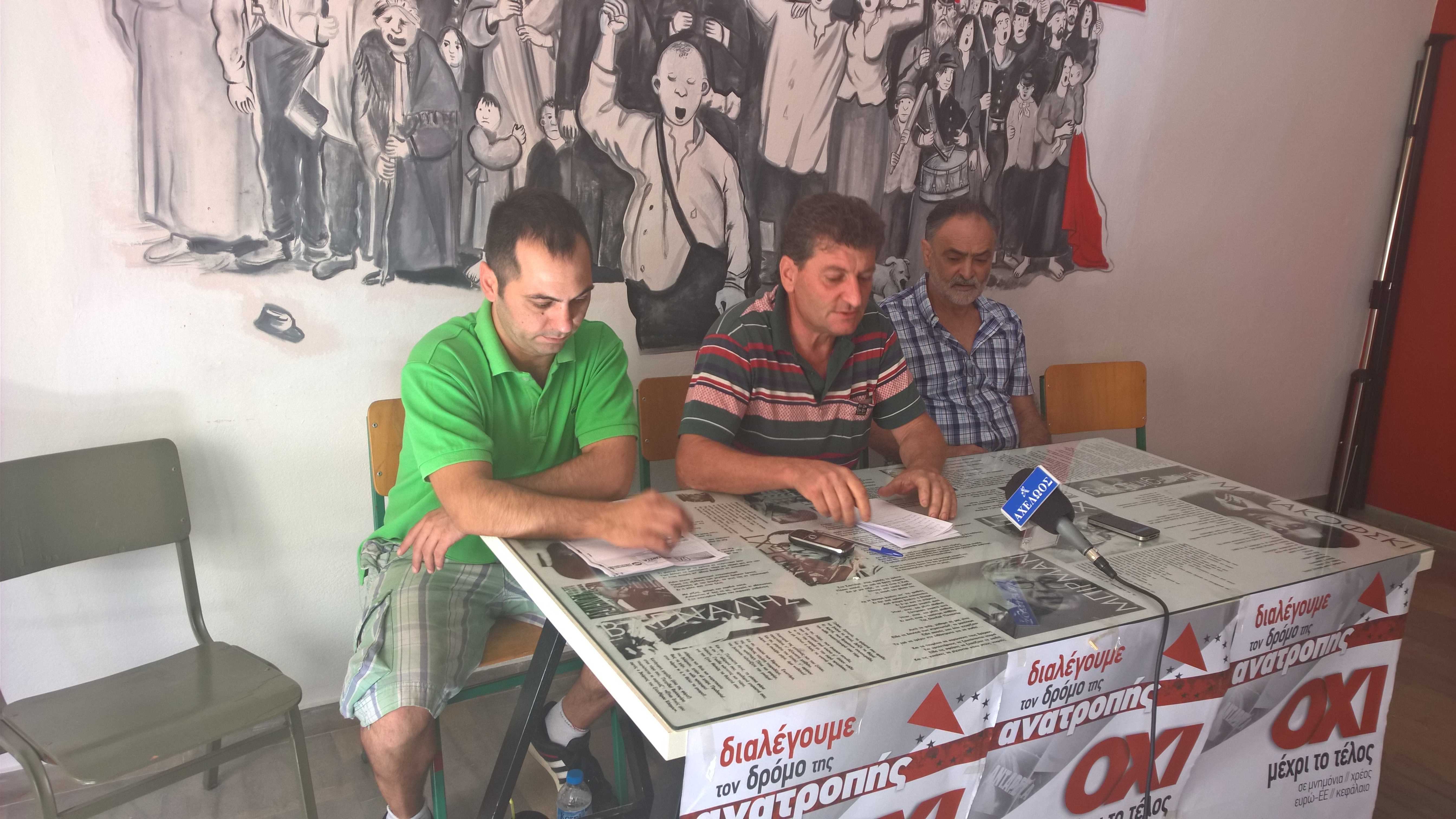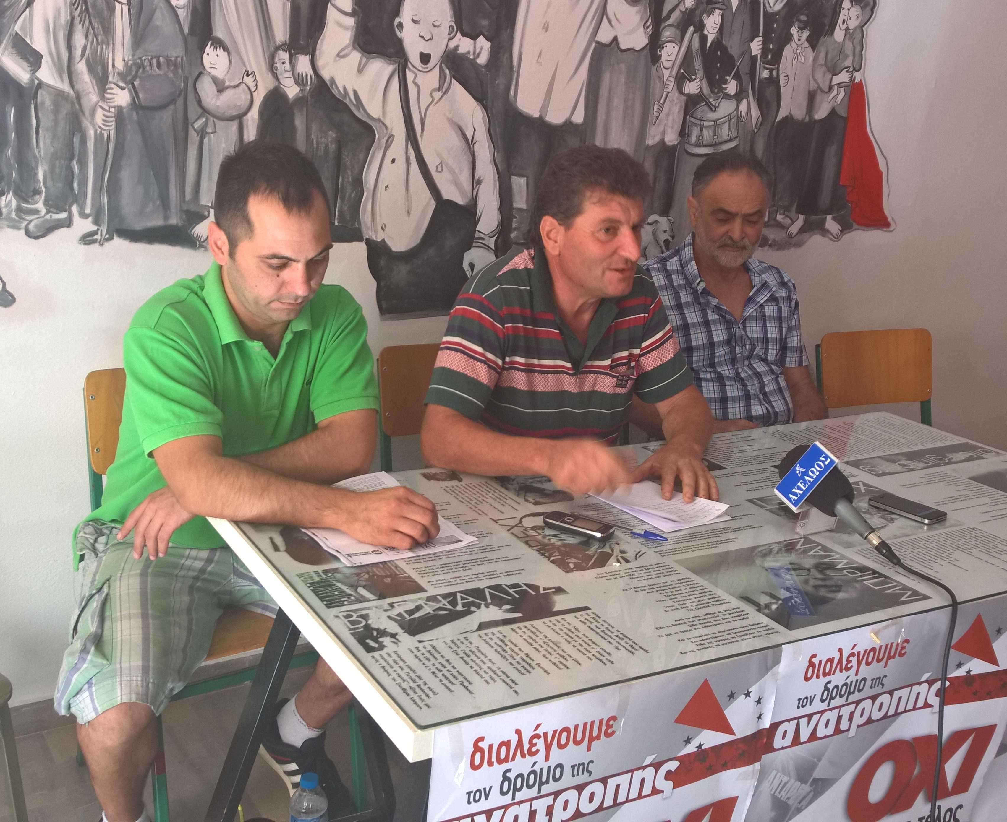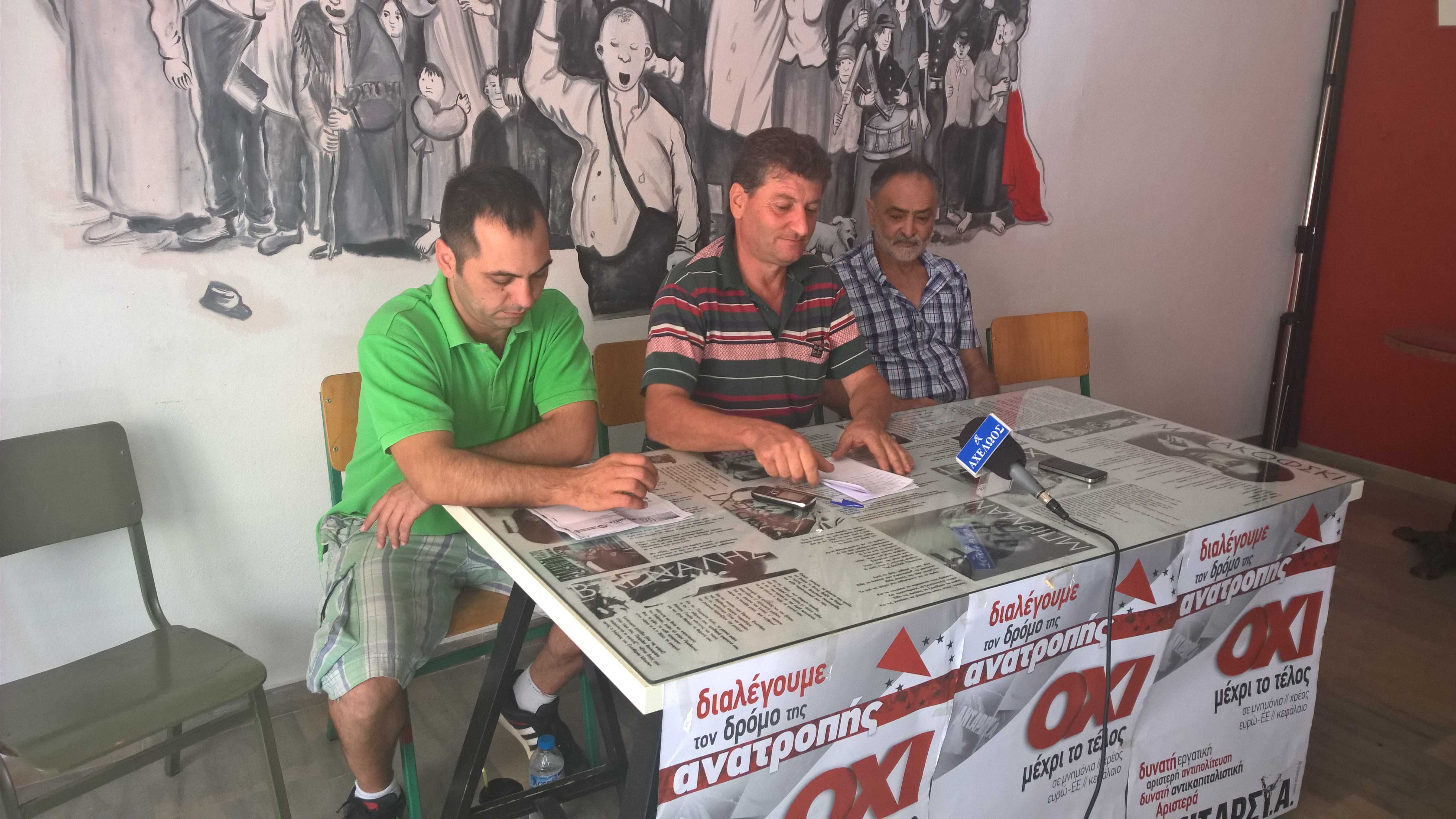 “Αποδείχτηκε ότι η κυβέρνηση δε μπορεί να λύσει τα προβλήματα. Υπάρχουν μόνο δυο λύσεις: είτε να μείνουμε μέσα στην Ευρωπαϊκή Ένωση είτε έξω από αυτή . Σήμερα αποδεικνύεται η σκληρή πολιτική των τελευταίων μηνών με το τρίτο μνημόνιο και με την γενικότερη επιδείνωση της κατάστασης. Θέλουμε απομάκρυνση του χρέους και αύξηση συντάξεων και μισθών και για αυτό πρέπει να δυναμωθεί η ΑΝΤΑΡΣΥΑ. Όλη αυτή η κατάσταση μας οδηγεί σε μεγαλύτερη εξάντληση και απαξίωση. Για να μπορέσουμε να απαλλαγούμε από αυτή τη κατάσταση αντίπαλος στη κάθε κυβέρνηση πρέπει να είναι το ίδιο αγροτικό κίνημα. Πρέπει να συμβάλει στην ανάπτυξη των αγώνων μετά τις εκλογές”.