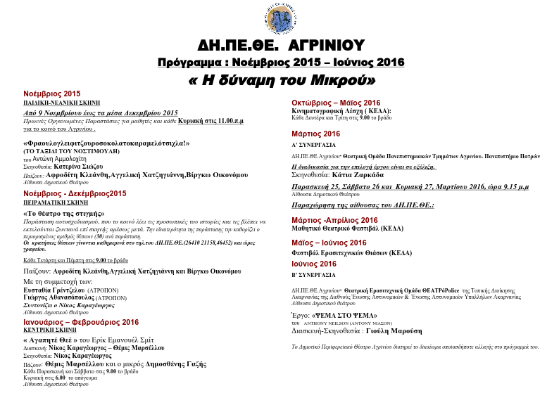 “Το πρόγραμμα του ΔΗΠΕΘΕ Αγρινίου ξεκινά το Νοέμβριο με την παιδική σκηνή ενώ ταυτόχρονα με αυτή θα παίζεται και η πειραματική σκηνή το Νοέμβριο και το Δεκέμβριο. Τα Χριστούγεννα θα γίνει και το φεστιβάλ των μονολόγων που γίνεται για πρώτη φορά στο Αγρίνιο. Το έργο “Αγαπητέ Θεέ” θα ανέβει Ιανουάριο-Φεβρουάριο του 2016. Η Κινηματογραφική Λέσχη θα λειτουργεί κανονικά από τον Οκτώβριο μέχρι τον Μάιο ενώ θα ενταχθούν και οι ομάδες του Πανεπιστημίου και της Αστυνομίας μέσα σε αυτό το διάστημα. Μετά από σχετική απόφαση, η αίθουσα θα δίδεται μόνο για θεατρικούς σκοπούς ενώ οποιεσδήποτε άλλες διαλέξεις και εκδηλώσεις θα μεταφερθούν στην Τράπεζα Ελλάδος η οποία αναβαθμίζεται με κάποια έργα που γίνονται στο κτίριο. Τον τελευταίο χρόνο περάσαμε μέσα από πολλές δυσκολίες για να κρατήσουμε το ΔΗΠΕΘΕ. Όταν ξεκινήσαμε περί τα τέλη Οκτώβρη έπρεπε να λειτουργήσουμε ένα ΔΗΠΕΘΕ χωρίς την παρουσία καλλιτεχνικού διευθυντή και χωρίς χρήματα. Κι αυτή η επιχορήγηση που δίνει ο Δ. Αγρινίου στο ΔΗΠΕΘΕ (150.000 ευρώ) ακυρώθηκε πολλές φορές και δεν δόθηκαν ποτέ στο ΔΗΠΕΘΕ γιατί έγιναν λάθη κατά τη διαδικασία. Όμως, με ένα νέο διοικητικό συμβούλιο και μια νέα δημοτική αρχή συνεδρίασαν και τα κατάφεραν για να βγει αυτό το αποτέλεσμα, αφού τα χρήματα μεταφέρθηκαν σε πρώτη φάση τον Ιούνιο και σήμερα θα έρθουν και τα υπόλοιπα. Έπειτα προκηρύξαμε την θέση του Καλλιτεχνικού Διευθυντή με μια διαδικασία η οποία ήταν ανοιχτή. Σε αυτή συμμετείχαν 19 άτομα και άλλα 2 εκπρόθεσμα κι από όλους αυτούς προκρίναμε 7 και στη συνέχεια 2. Με βάση τα βιογραφικά των 2 που έμειναν στο τέλος επιλέξαμε τελικά τον κ. Καραγέωργο”. Ο Δήμαρχος Αγρινίου κ. Γ. Παπαναστασίου ευχαρίστησε έναν προς έναν όλους όσους πάλεψαν και συνεχίζουν να παλεύουν για το ΔΗ.ΠΕ.ΘΕ.