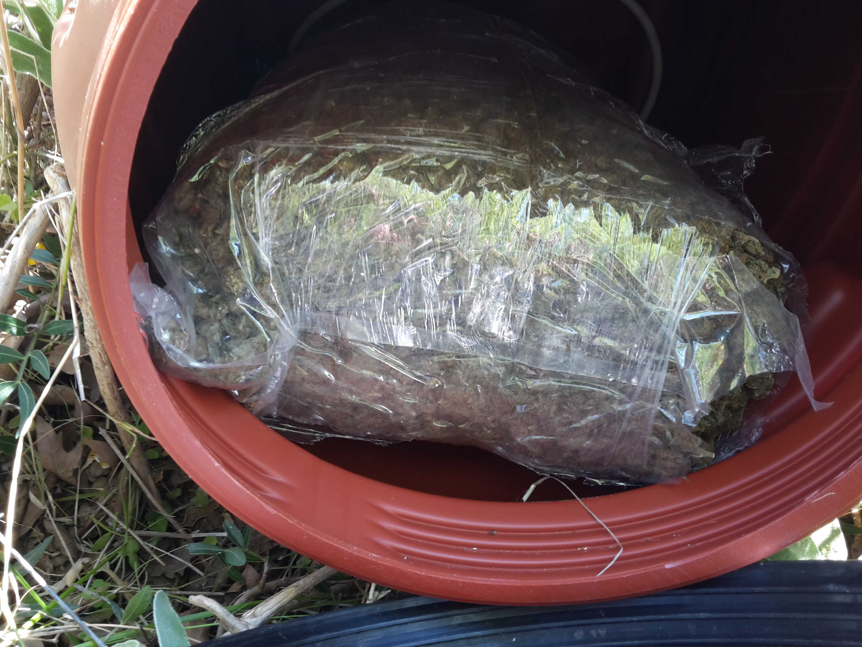 Στη συνέχεια ο δράστης μετέβη σε ερημική τοποθεσία στο Πλατάνι Πατρών, όπου τοποθέτησε τις ναρκωτικές ουσίες μέσα σε πλαστικό βαρέλι, το οποίο απέκρυψε κάτω από θάμνους.