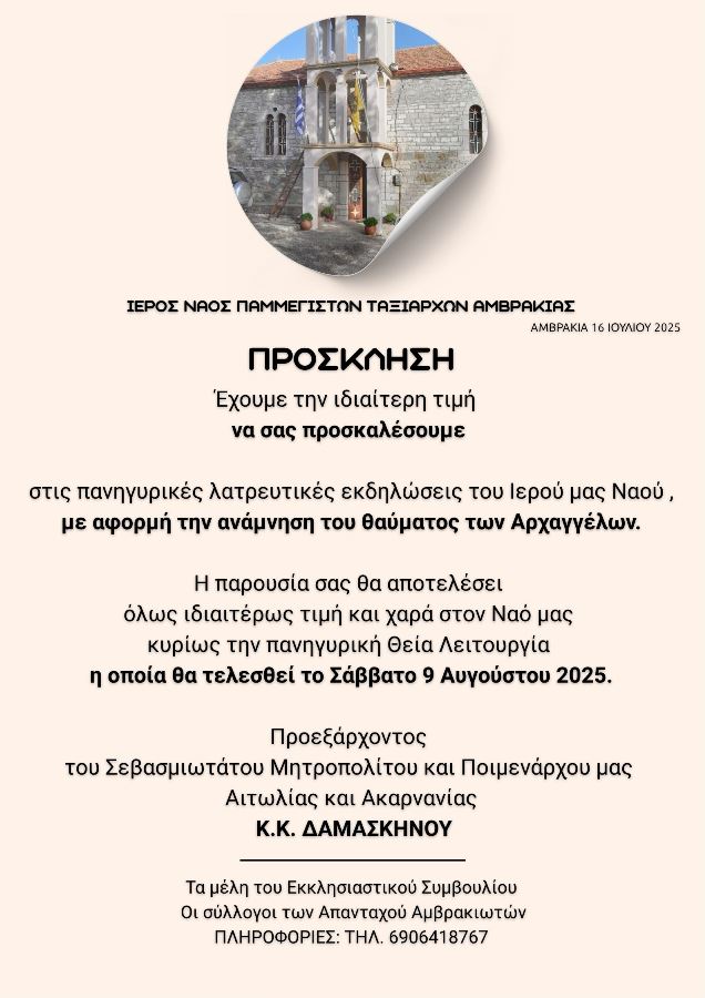 Σύλλογος Απανταχού Αμβρακιωτών: Πρόσκληση στις πανηγυρικές λατρευτικές εκδηλώσεις του Ι.Ν. Παμμέγιστων Ταξιαρχών με αφορμή την ανάμνηση του θαύματος των Αρχαγγέλων