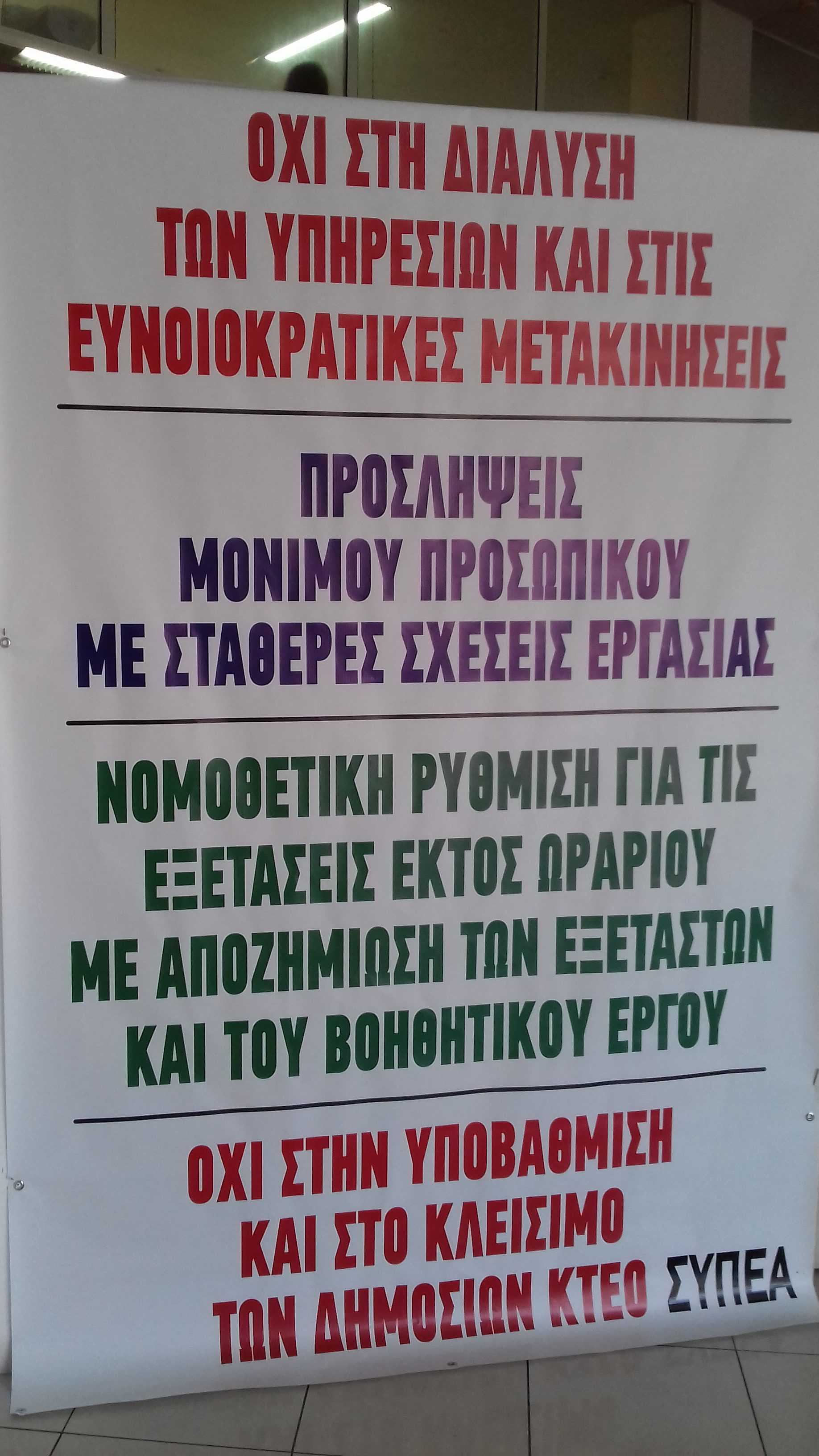 - Κατάργηση του αντιδραστικού πλαισίου της αξιολόγησης, που υπηρετεί αντεργατικούς -αντιλαϊκούς σκοπούς. Συνέχιση της «απεργίας-αποχής» και δυνάμωμα του αγώνα με μεγαλύτερη αποφασιστικότητα. Όχι σε διαδικασίες επιλογής θέσεων ευθύνης με «σημαδεμένα χαρτιά». Επίσπευση των διαδικασιών επιλογής. Αξιοποίηση της ΣΣΕ για την πιστοποίηση από Δημόσιους εκπαιδευτικούς φορείς της γνώσης Η/Υ.