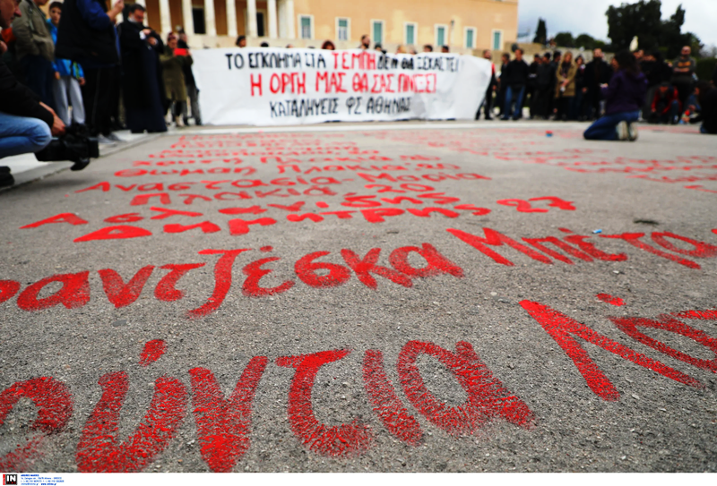 Συγκλονιστικές στιγμές στο Σύνταγμα κατά τη διάρκεια της πορείας. Οι συγκεντρωμένοι έγραψαν με κόκκινη μπογιά τα 57 ονόματα των θυμάτων των Τεμπών μπροστά από το μνημείο του Αγνώστου Στρατιώτη.