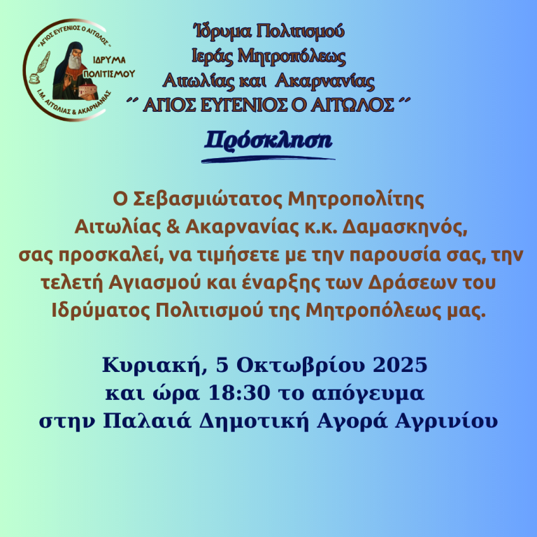 Την προσεχή Κυρικαή, 5 Οκτωβρίου 2025 και ώρα 6:30 το απόγευμα, στην αίθουσα της Παλαιάς Δημοτικής Αγοράς Αγρινίου, θα πραγματοποιηθεί από τον Σεβασμιώτατο Μητροπολίτη Αιτωλίας και Ακαρνανίας κ. Δαμασκηνό. η τέλεση του Αγιασμού για την έναρξη των φετινών μαθημάτων και δράσεων του Ιδρύματος Πολιτισμού της Τοπικής μας Εκκλησίας «ΑΓΙΟΣ ΕΥΓΕΝΙΟΣ Ο ΑΙΤΩΛΟΣ΄».