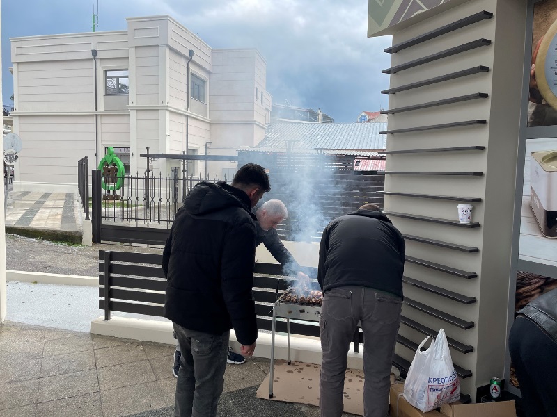 Οι εργαζόμενοι του Α. Σ. Ένωση Αγρινίου, παρά τις άσχημες καιρικές συνθήκες που επικράτησαν σήμερα στην πόλη, τηρώντας και φέτος την παράδοση, «τσίκνισαν» έξω από το Κατάστημα Συνεταιριστικών Προϊόντων, δίπλα απ’ τα κεντρικά γραφεία του συνεταιρισμού, στην οδό Παπαϊωάννου 15, όπου από νωρίς στήθηκαν οι ψησταριές και φυσικά υπήρχαν πολλά συνοδευτικά των κρεάτων, όπως ελιές παραγωγής μας και τυριά Αμφιλοχίας Γη κ.α., από το ίδιο το κατάστημα.