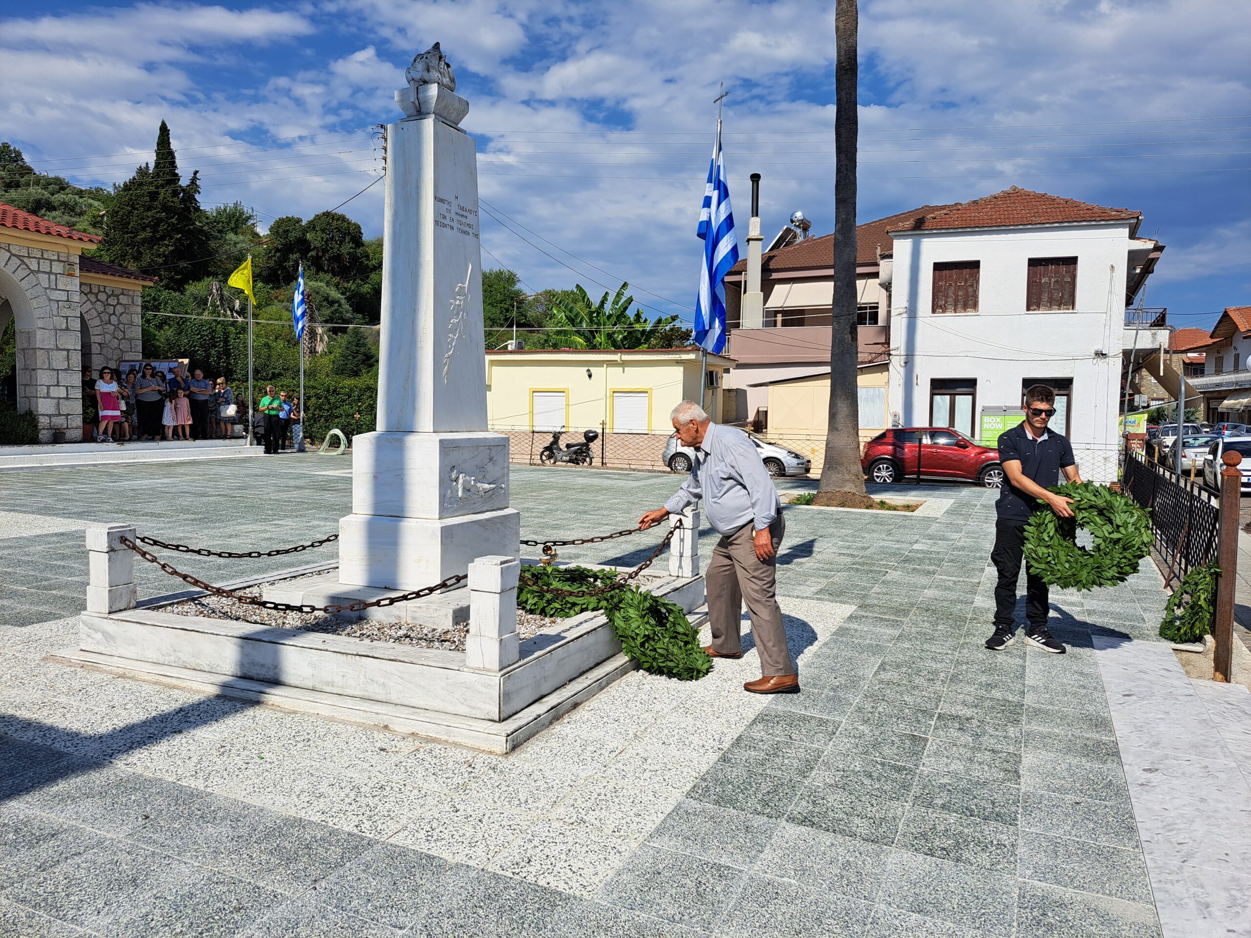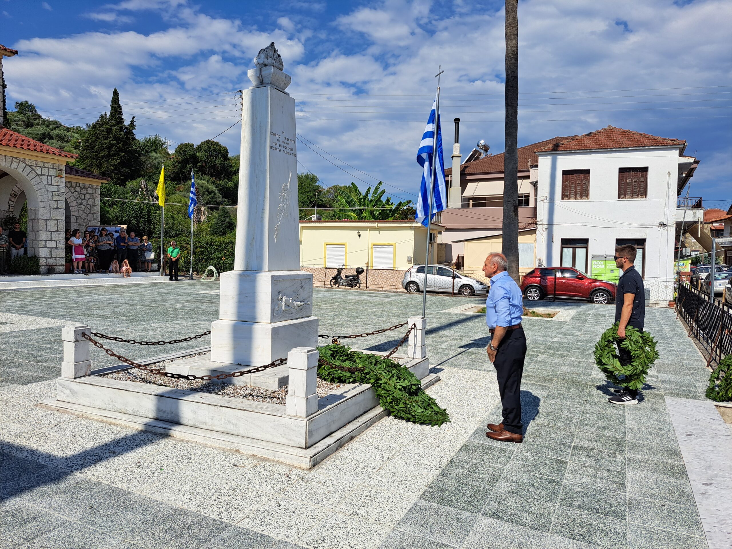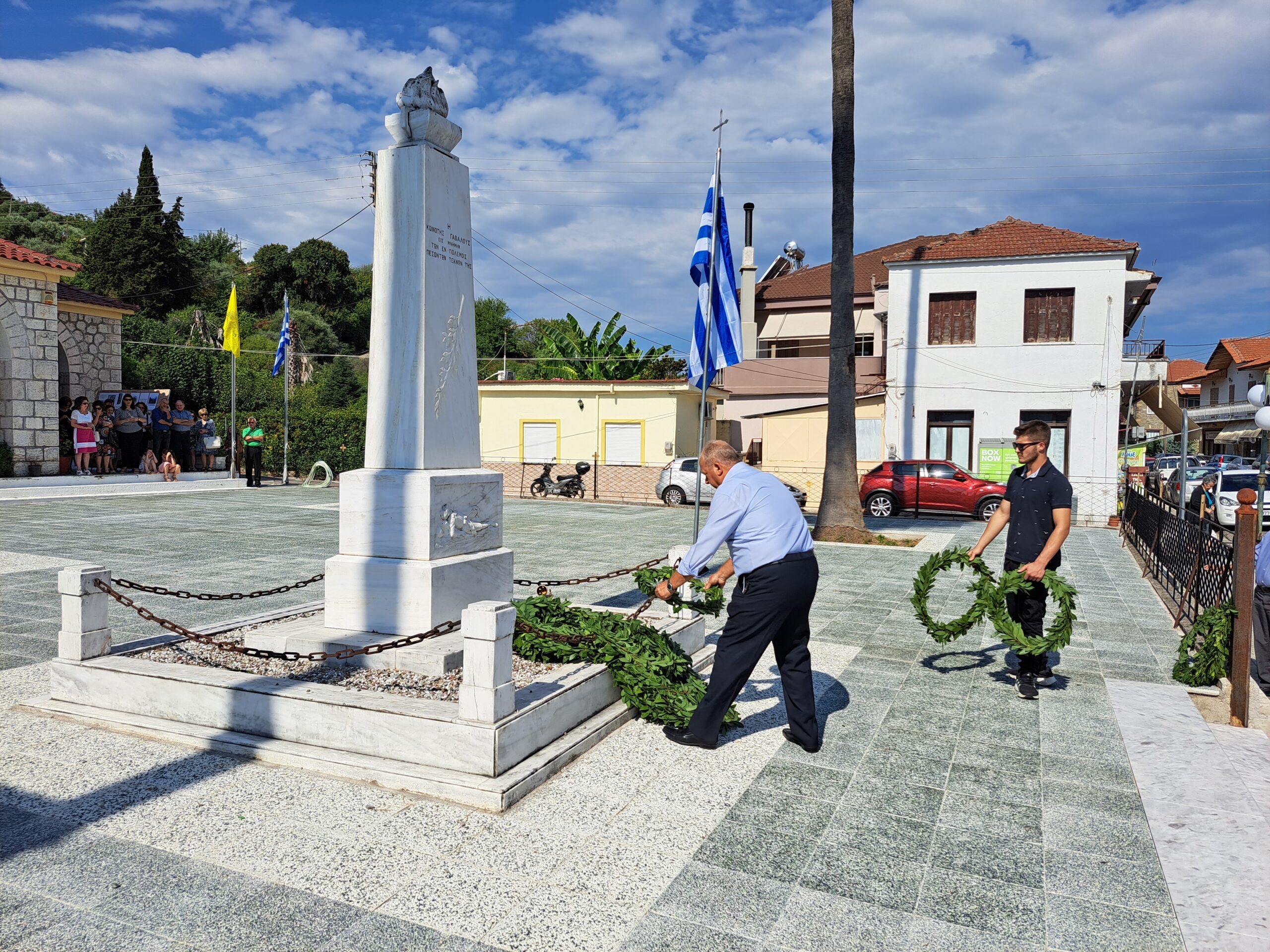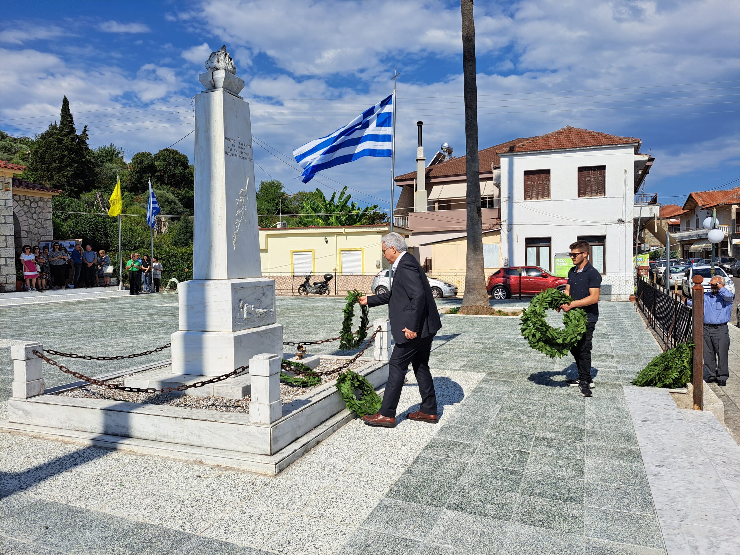 Αμέσως μετά έγινε η κατάθεση στεφάνων στο Μνημείο των Πεσόντων από τον Δήμαρχο Αγρινίου Γιώργο Παπαναστασίου, τον Αντιπεριφερειάρχη Λ.Δημητρογιάνη, τον πρόεδρο της Κ. Γαβαλούς Α. Γούλα, τον πρώην Δήμαρχο Δ.Τραπεζιώτη, τον Διοικητή του ΠΣ Γαβαλους Στάθη Λαγό, τον πρ. Κ.Δαφνια Π.Μακρυγιάννη, τον πρ. Κ. Λιθοβουνίου Κ.Αλεξανδρή, τον πρ. Ματαραγκας Γ.Αγγέλη, τον πρ. Τριχωνίου Α.Γκολφίνο, τον πρ. της Ένωσης Αποστράτων Αξιωματικών Π. Τσαντζαλο, εκπρ. Συνδεσμου Απ. Σωματων ΑΣ. Αγρινίου Κ.Νταβαρίνο , εκπρ. Εθνικής Αντίστασης Ν. Τσάτσος, τον πρ. του Συλλόγου Γαβαλιωτών Αθήνας, Άρη Σουφλή, ο Πρόεδρος του πολιτιστικού συλλόγου Καζανέικων κ. Παναγιώτης Καζανάς, ΤΟΕΒ Παμφιας κ. Γιαννέλος, τον εκπρ. του Συλλόγου Καψοραχιωτων Κ. Κουμπουλή, της προέδρου “Αγριωνις Γαία ” Βίκυς Αγγέλη, εκπρόσωπους των οικογενειών Δημητρέλη, Τραγουλιά, Σιαμπαλή.