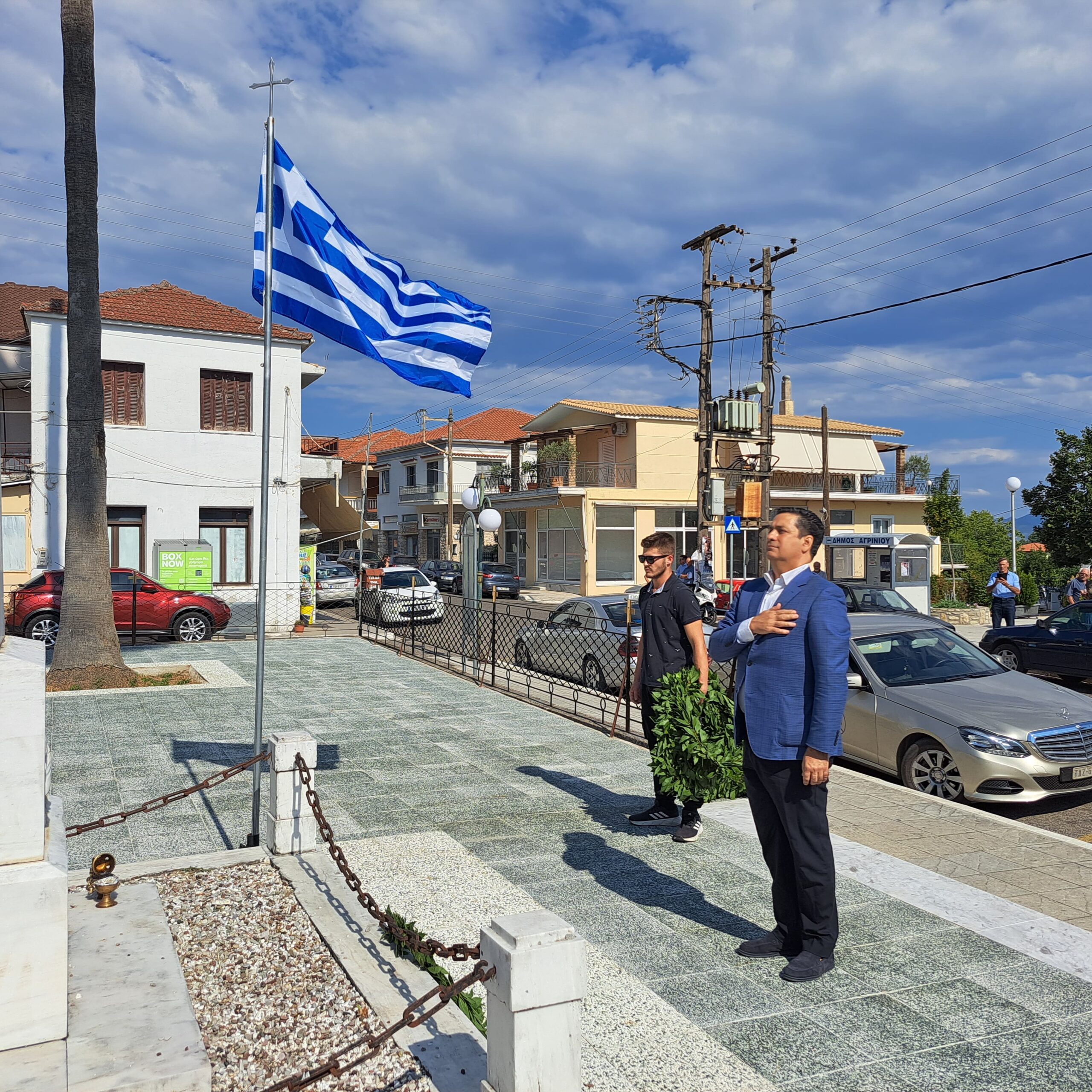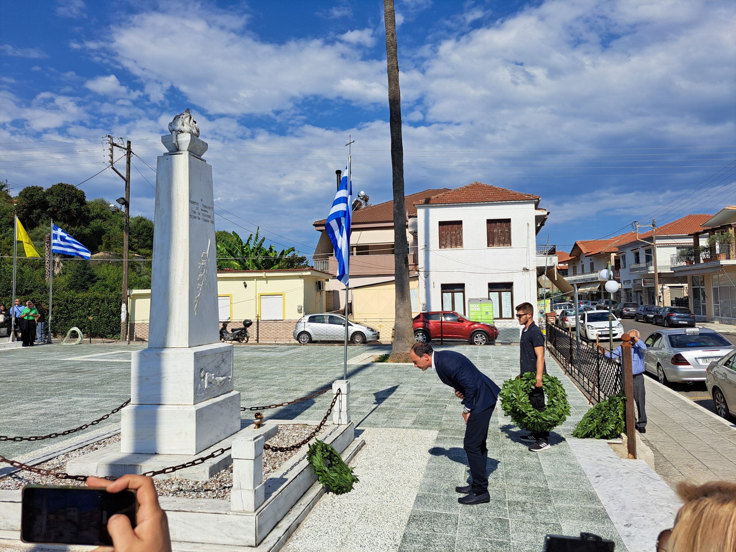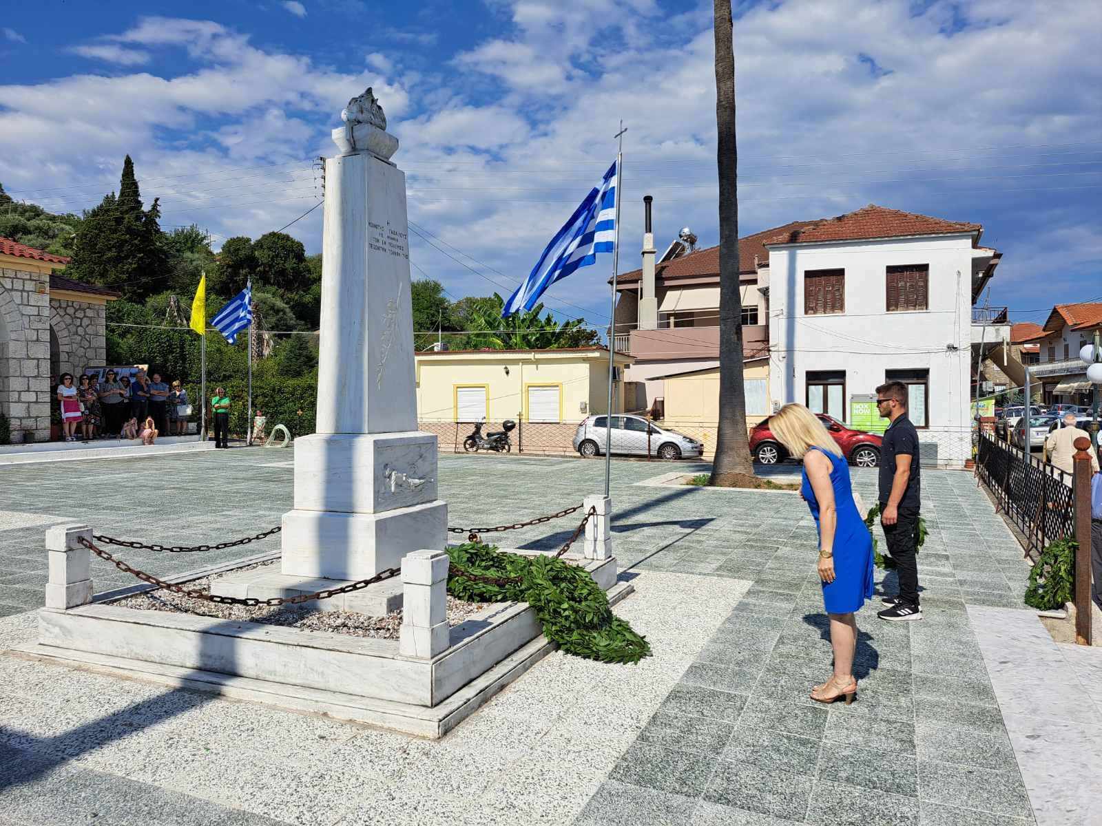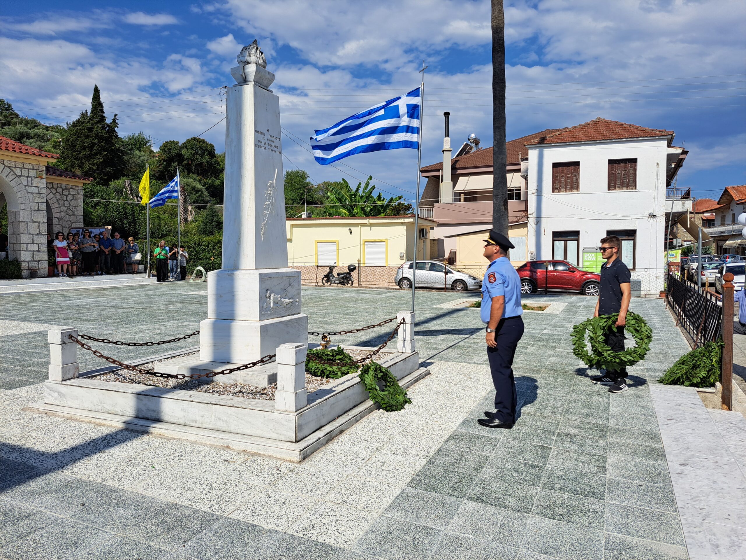 Αμέσως μετά έγινε η κατάθεση στεφάνων στο Μνημείο των Πεσόντων από τον Δήμαρχο Αγρινίου Γιώργο Παπαναστασίου, τον Αντιπεριφερειάρχη Λ.Δημητρογιάνη, τον πρόεδρο της Κ. Γαβαλούς Α. Γούλα, τον πρώην Δήμαρχο Δ.Τραπεζιώτη, τον Διοικητή του ΠΣ Γαβαλους Στάθη Λαγό, τον πρ. Κ.Δαφνια Π.Μακρυγιάννη, τον πρ. Κ. Λιθοβουνίου Κ.Αλεξανδρή, τον πρ. Ματαραγκας Γ.Αγγέλη, τον πρ. Τριχωνίου Α.Γκολφίνο, τον πρ. της Ένωσης Αποστράτων Αξιωματικών Π. Τσαντζαλο, εκπρ. Συνδεσμου Απ. Σωματων ΑΣ. Αγρινίου Κ.Νταβαρίνο , εκπρ. Εθνικής Αντίστασης Ν. Τσάτσος, τον πρ. του Συλλόγου Γαβαλιωτών Αθήνας, Άρη Σουφλή, ο Πρόεδρος του πολιτιστικού συλλόγου Καζανέικων κ. Παναγιώτης Καζανάς, ΤΟΕΒ Παμφιας κ. Γιαννέλος, τον εκπρ. του Συλλόγου Καψοραχιωτων Κ. Κουμπουλή, της προέδρου “Αγριωνις Γαία ” Βίκυς Αγγέλη, εκπρόσωπους των οικογενειών Δημητρέλη, Τραγουλιά, Σιαμπαλή.