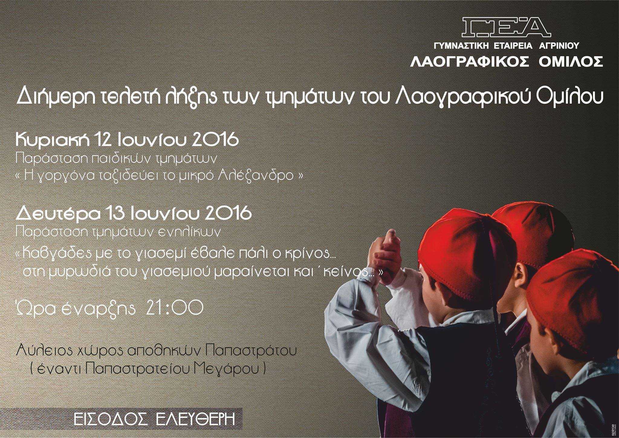 Με μια λαμπρή τελετή λήξης ολοκληρώνονται οι δραστηριότητες των τμημάτων του Λαογραφικού Ομίλου της Γυμναστικής Εταιρείας Αγρινίου (ΓΕΑ) για την χορευτική περίοδο 2015-2016.