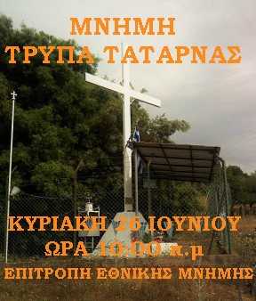 Την Κυριακή 26 Ιουνίου και ώρα 10:00 π.μ θα τελεστεί το ετήσιο μνημόσυνο στη μνήμη των σφαγιασθέντων από τους κομμουνιστές του ΕΑΜ-ΕΛΑΣ στην Τρύπα της Τατάρνας Ευρυτανίας κατά τα έτη 1941 – 1944.