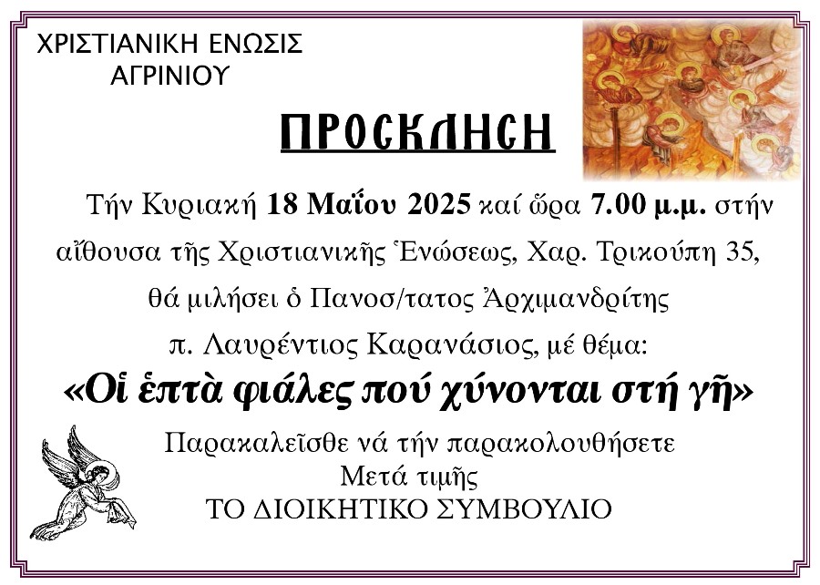 Την Κυριακή 18 Μαΐου και ώρα 7:00 μ.μ. στην αίθουσα της Χριστιανικής Ενώσεως Αγρινίου θα πραγματοποιηθεί η τελευταία ομιλία προς το κοινό για το ιεραποστολικό έτος 2024 – 2025.