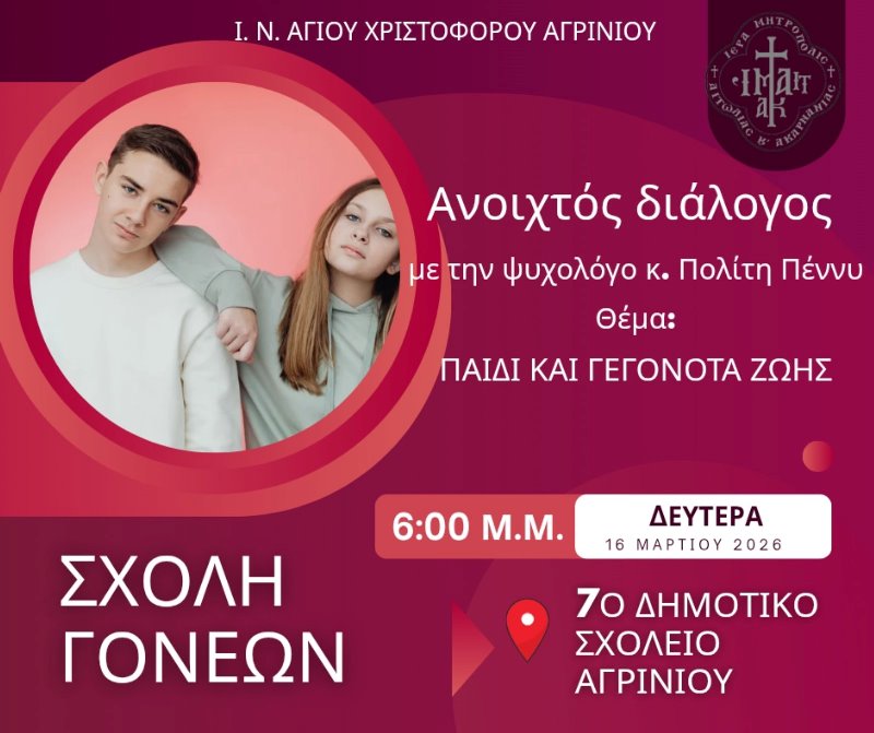 Ακολουθεί πρόσκληση σχετικά με την τελευταία συνάντηση της ενοριακής σχολής Γονέων του Ιερού Ναού Αγίου Χριστοφόρου Αγρινίου που θα πραγματοποιηθεί τη Δευτέρα 16 Μαρτίου 2026 στο 7ο Δημοτικό σχολείο Αγρινίου και ώρα 18:00.