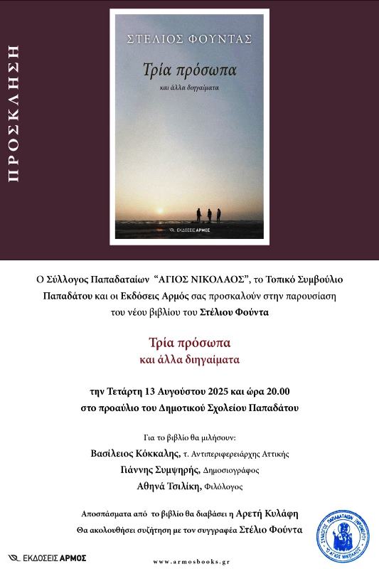 Ο Σύλλογος Παπαδαταίων «ΑΓΙΟΣ ΝΙΚΟΛΑΟΣ», το Τοπικό Συμβούλιο Παπαδάτου Ξηρομέρου και οι Εκδόσεις Αρμός σας προσκαλούν στην παρουσίαση του βιβλίου του Στέλιου Φούντα ” Τρία πρόσωπα και άλλα διηγαίματα” την Τετάρτη 13 Αυγούστου 2025 και ώρα 20.00 στο προαύλιο του Δημοτικού Σχολείου Παπαδάτου Ξηρομέρου.