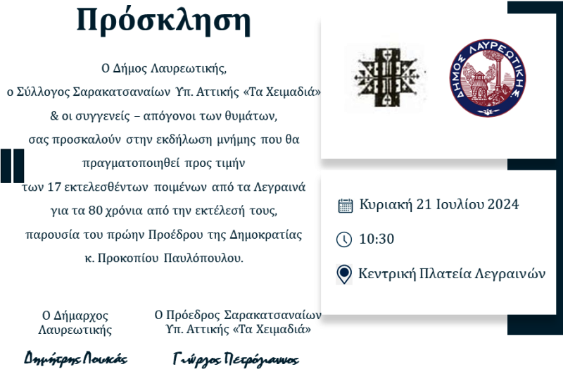 Ο κ Πέτρος Φιλίππου-Αγγέλου, Ιστορικός Αρχαιολόγος, πρώην Δήμαρχος Σαρωνικού ενημέρωσε ότι ο Δήμος Λαυρεωτικής, με τον Σύλλογο Σαρακατσαναίων Υπολοίπου Αττικής και τους συγγενείς-απογόνους των ηρώων, οργανώνουν εκδήλωση μνήμης προς τιμήν των δέκα επτά (17) εκτελεσθέντων βοσκών, 80 χρόνια από την εκτέλεσή τους, παρουσία του πρώην Προέδρου της Δημοκρατίας κ. Προκοπίου Παυλόπουλου. Η εκδήλωση μνήμης με κατάθεση στεφάνου και εκφώνηση σύντομου ιστορικού θα γίνει στην κεντρική πλατεία των Λεγραινών, Δήμου Λαυρεωτικής, Αττικής, την Κυριακή 21 Ιουλ 2024, στις 10.30, εκεί που υπάρχει μνημείο για του 17 κτηνοτρόφους.