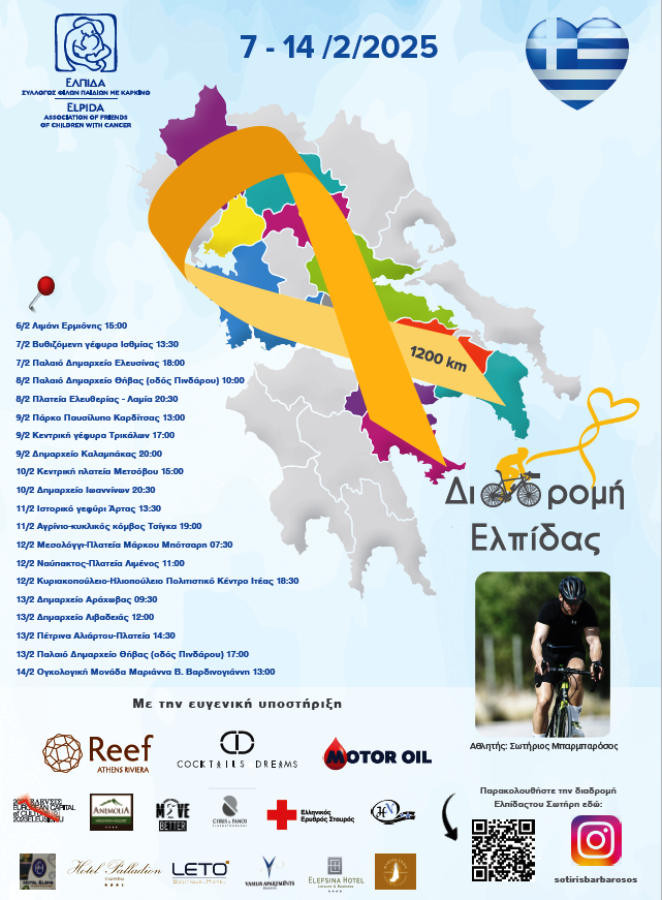 Την Παρασκευή 7 Φεβρουαρίου, με αφετηρία την Ερμιόνη, γενέτειρα της ιδρύτριας του Σωματείου «ΕΛΠΙΔΑ», Μαριάννας Β. Βαρδινογιάννη, και τελικό προορισμό την Ογκολογική Μονάδα Παίδων “Μαριάννα Β. Βαρδινογιάννη – ΕΛΠΙΔΑ” στις 14 Φεβρουαρίου 2025, ο Σωτήρης θα σχηματίσει με τη διαδρομή του τη χρυσή κορδέλα, το παγκόσμιο σύμβολο του αγώνα κατά του Παιδικού και Εφηβικού Καρκίνου.