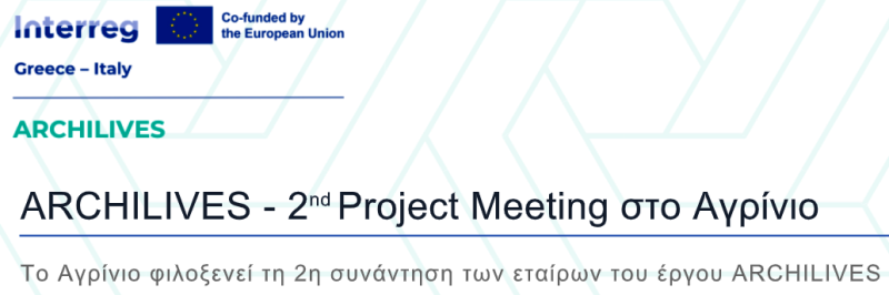 Στις 12 και 13 Μαρτίου θα πραγματοποιηθεί στο Αγρίνιο η 2η συνάντηση των Εταίρων του ευρωπαϊκού έργου ARCHILIVES – “Technologies and Digitisation to Make Archives Villages of New Memories and Experiences”, το οποίο υλοποιείται στο πλαίσιο του Προγράμματος Interreg VI-A Ελλάδα–Ιταλία.