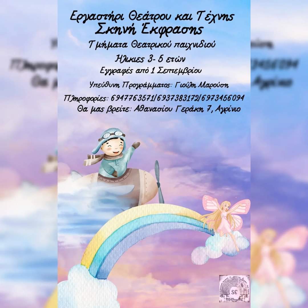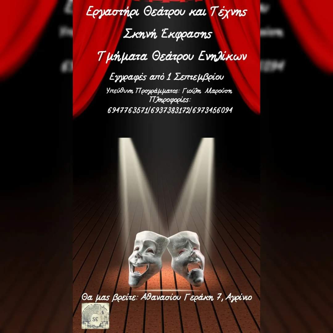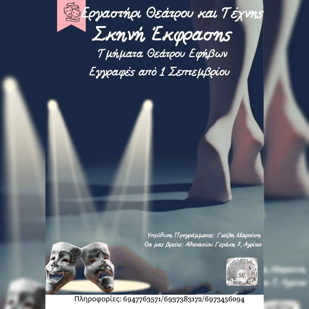 Το εργαστήριο Θεάτρου και Τέχνης «Σκηνή Έκφρασης» ανοίγει τις πόρτες του για τη νέα χρονιά την Δευτέρα 09 Ιανουαρίου με τα εξής τμήματα: